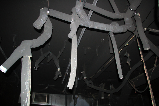 Hệ thống ống dẫn nước thải của chung cư hư hỏng nặng sau hoả hoạn, bốc mùi khó chịu. Ngoài 150 xe máy, 13 ôtô bị cháy rụi thì hệ thống điện nước, xử lý chất thải dưới hầm bị hư hỏng nặng.