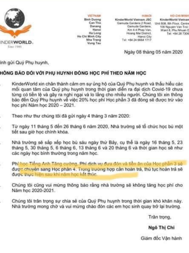“Tuy nhiên, trước đó chúng tôi không hề được nhận bất cứ một văn bản nào khác, vậy thì vì lý do gì mà nhà trường lại nói trường thu của phụ huynh từ 80-100% học phí trong thời gian học sinh nghỉ vì dịch như vậyT. Việc thông báo chỉ gửi 20% học phí vào năm học sau trong trường hợp con tôi không học ở đây nữa sẽ thế nào. Việc thông báo mập mờ này làm cho phụ huynh như tôi hiểu rằng nếu con tôi không học ở đây nữa sẽ mất toàn bộ số tiền học phí”, chị T. nói.