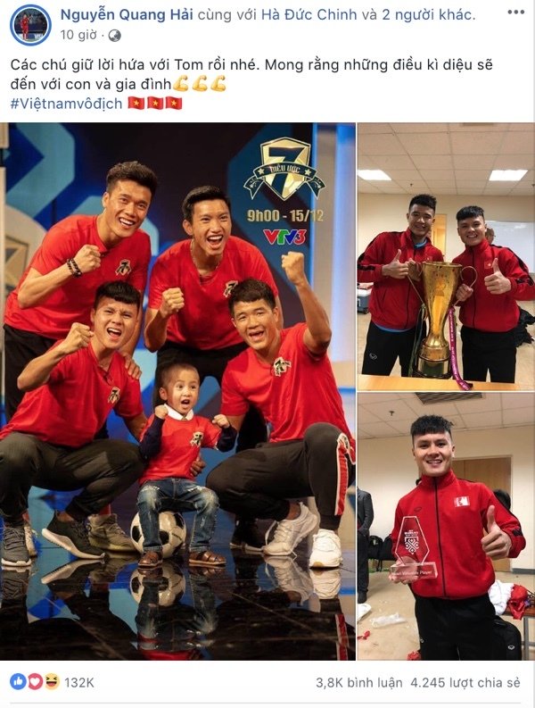 Vừa kết thúc trận đấu, Quang Hải đã để lại dòng tâm trạng như trả nợ cho lời hứa thành hiện thực của cậu bé ung thư Tom.