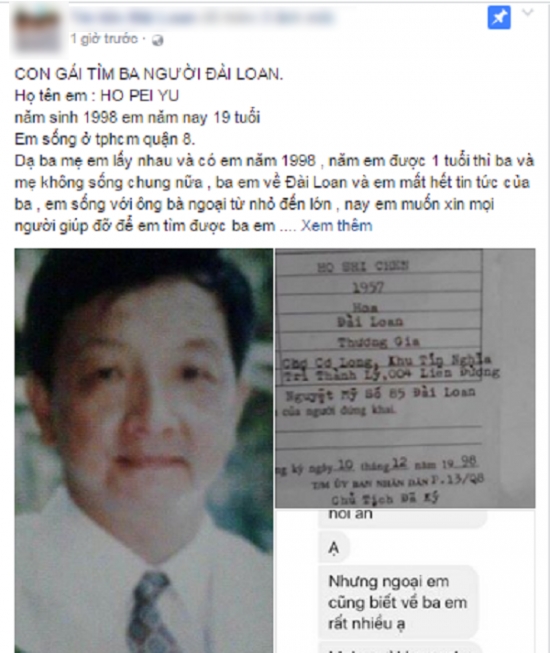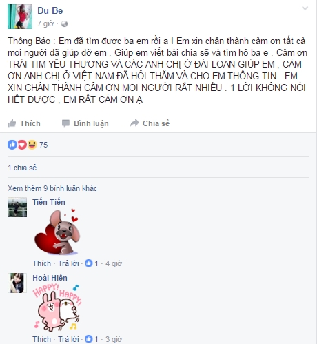 Em viết: “Em đã tìm được ba em rồi ạ! Em xin chân thành cảm ơn tất cả mọi người đã giúp đỡ em, giúp em viết bài chia sẻ và tìm hộ ba em. Cảm ơn Trái tim yêu thương và các anh chị ở Đài Loan giúp em, cảm ơn anh chị ở Việt Nam đã hỏi thăm và cho em thông tin. Em xin chân thành cảm ơn mọi người rất nhiều. Một lời không nói hết được, em rất cảm ơn ạ”.