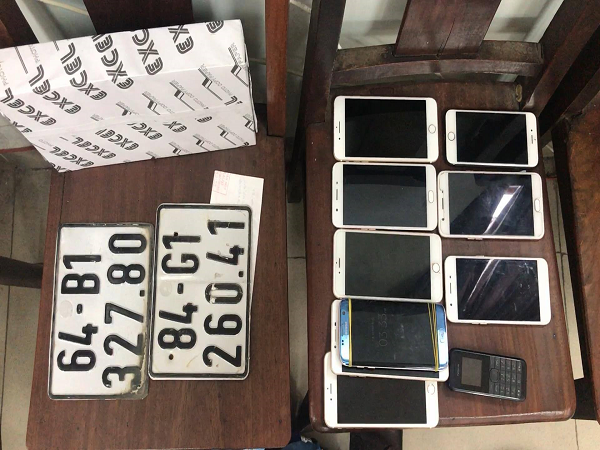 Tang vật Công an đã thu giữ hơn 10 ĐTDĐ, 2 biển số giả và nhiều công cụ hỗ trợ khác. Theo Công an còn tình nghi nhóm này đã thực hiện nhiều vụ cướp táo tợn ở các quận, huyện lân cận.