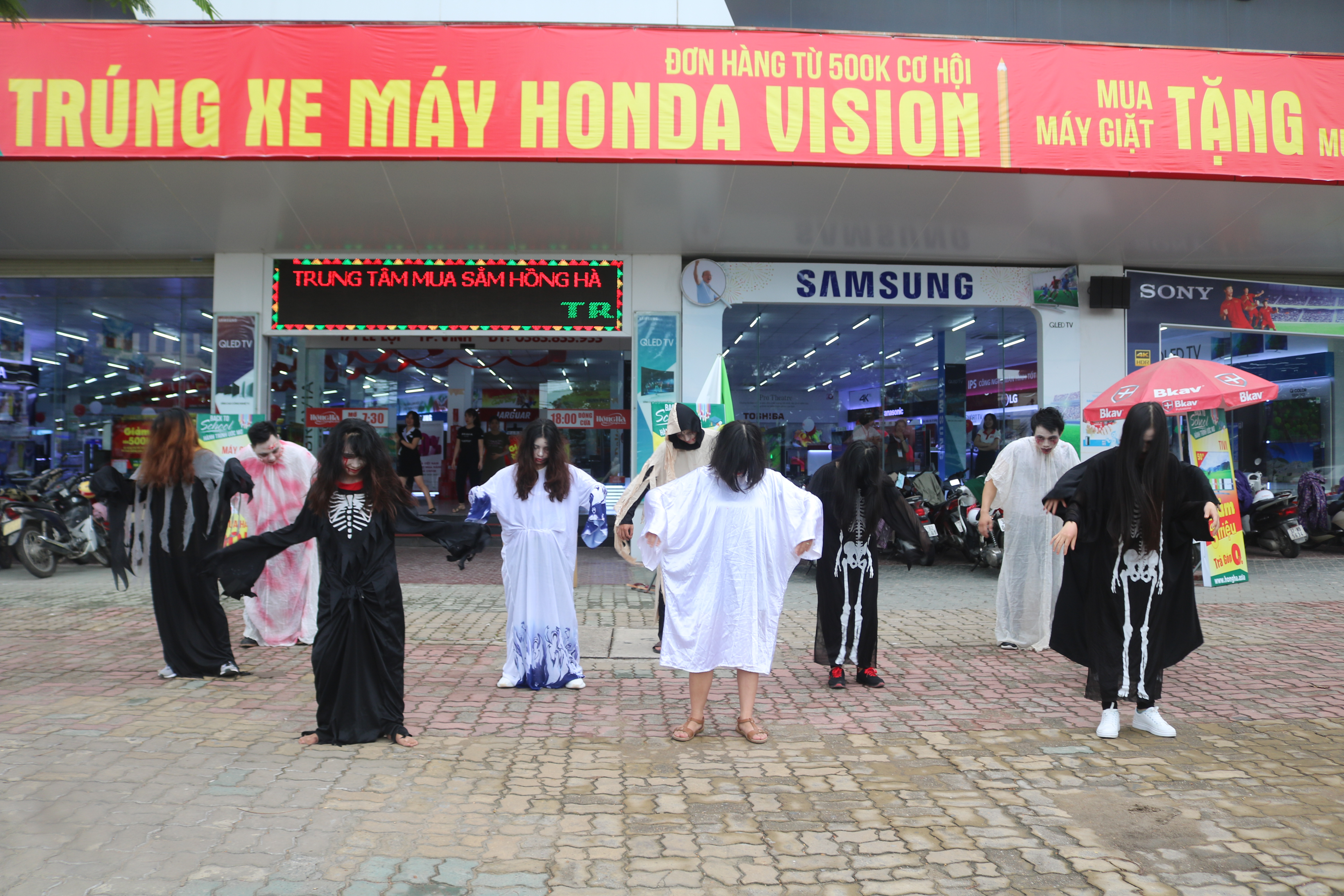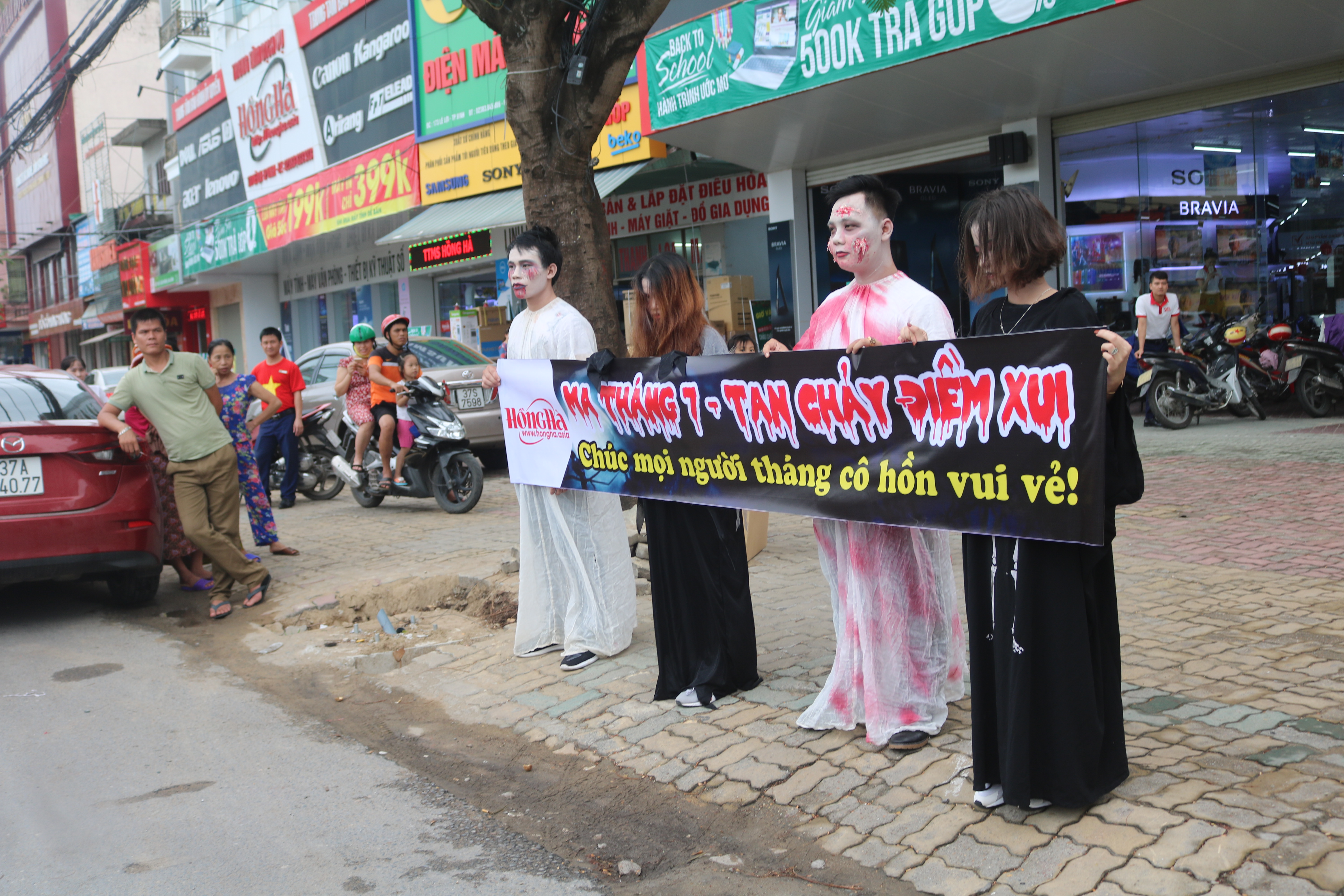 Vào khoảng 15h30 ngày 25/8 (tức 15/7 AL), trên đoạn đường Lê Lợi (thành phố Vinh, Nghệ An), xuất hiện một nhóm thanh niên khoảng hơn 10 người hóa trang vô cùng kinh dị, ma quái.