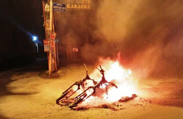 Nhóm 4 thanh niên nhốn nháo, lên xe máy bỏ ra đường với biểu hiện quá khích. Đi đến giữa đường, 2 thanh niên trong nhóm bất ngờ dừng xe châm lửa đốt 2 xe máy hiệu Wave và Dream rồi bỏ chạy.