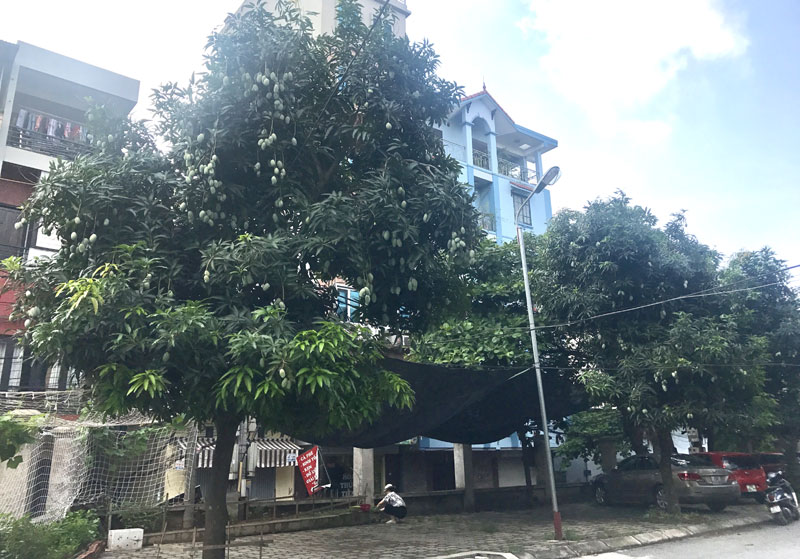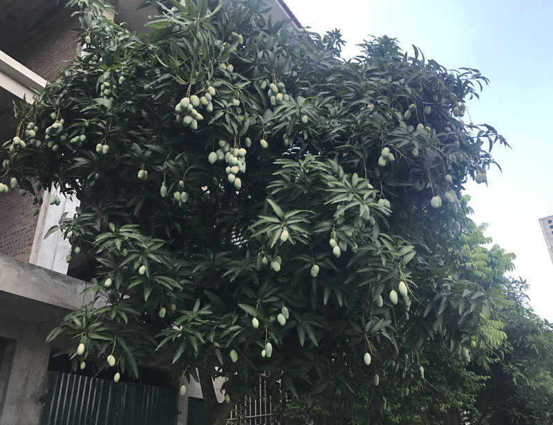 Tại một khu đô thị ở phố Định Công (Hoàng Mai, Hà Nội), xoài được trồng trên vỉa hè trước nhà dân đều được mùa.