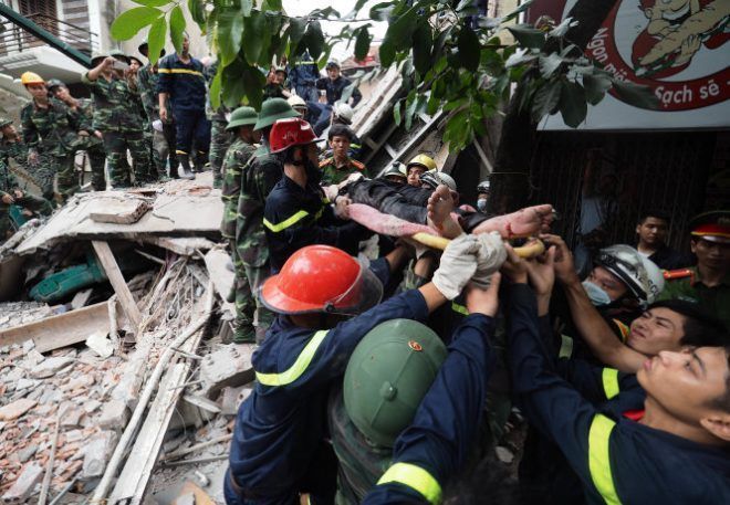 Sau khi vụ việc xảy ra, hàng chục xe cứu hỏa, cứu thương, lực lượng công an, bộ đội đã được điều tới hiện trường thực hiện công tác cứu nạn. 5 người đã được cứu ra từ đống đổ nát. 2 người khác không may mắn qua đời.