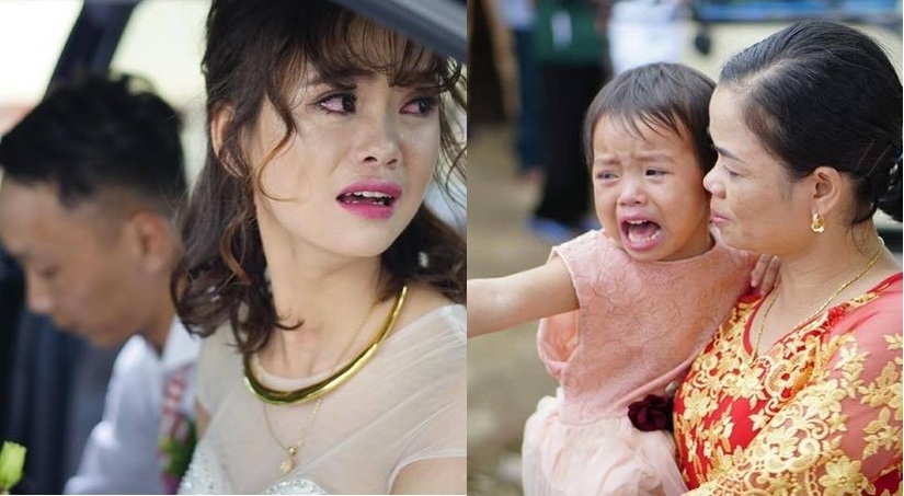 Theo đó, bé gái òa khóc nức nở trên tay mẹ và cố gắng nhào về phía trước để giữ chị lại, không cho chị đi lấy chồng. Nhìn thấy cảnh đó, cô dâu bước lên xe hoa mà mắt lệ nhòa, không muốn rời xa đứa em gái bé bỏng của mình.