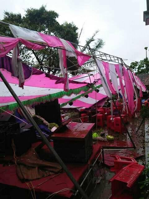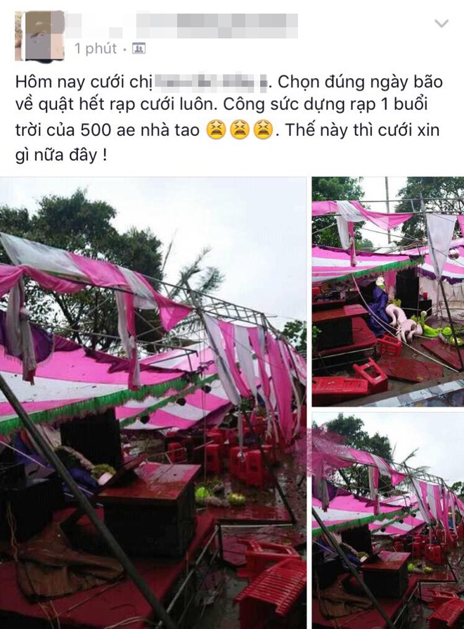 Mưa lớn, gió giật mạnh, nhiều đám cưới diễn ra trong ngày này “đen đủi” bị phá tan hoang. Ảnh hưởng của bão rõ ràng nhất có lẽ là đám cưới của một cặp đôi ở Quỳnh Lưu, Nghệ An. Toàn bộ rạp cưới đã đổ sập trong gió lốc.