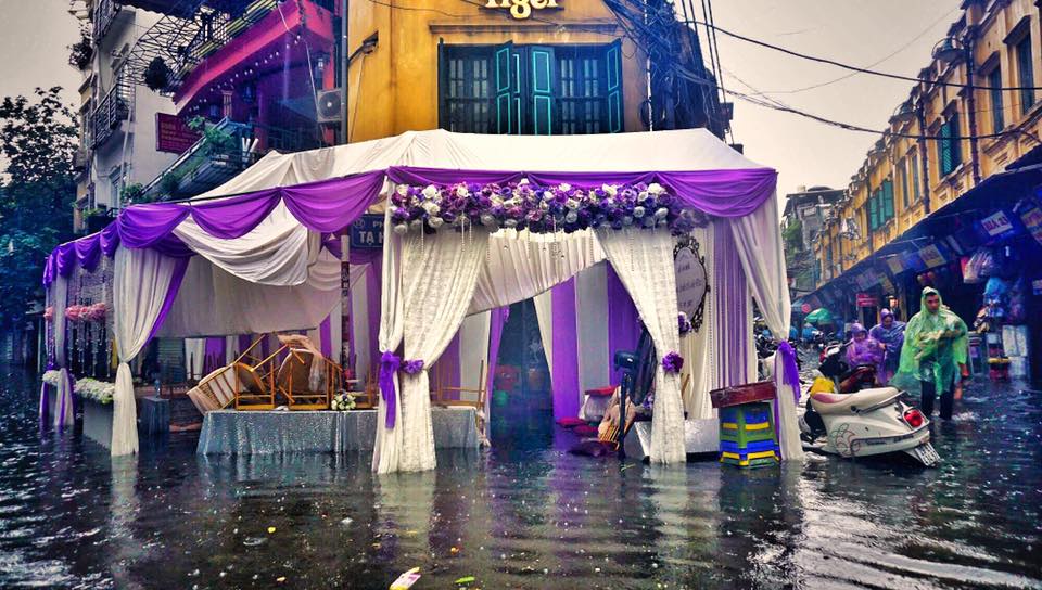 Rạp cưới ngay giữa ngã tư Tạ Hiện bị ngập nước. Ảnh: Giang Huy