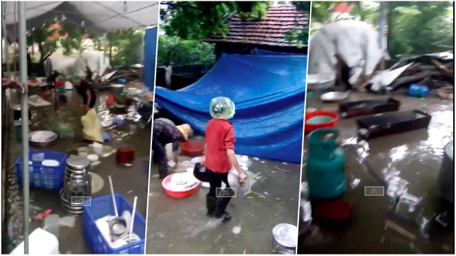 Một đám cưới khác cũng bị ảnh hưởng nặng nề của cơn bão khi mưa lớn khiến toàn bộ sân tổ chức đám cưới bị ngập. Bàn ghế, bát đũa… đều chìm sâu trong nước.