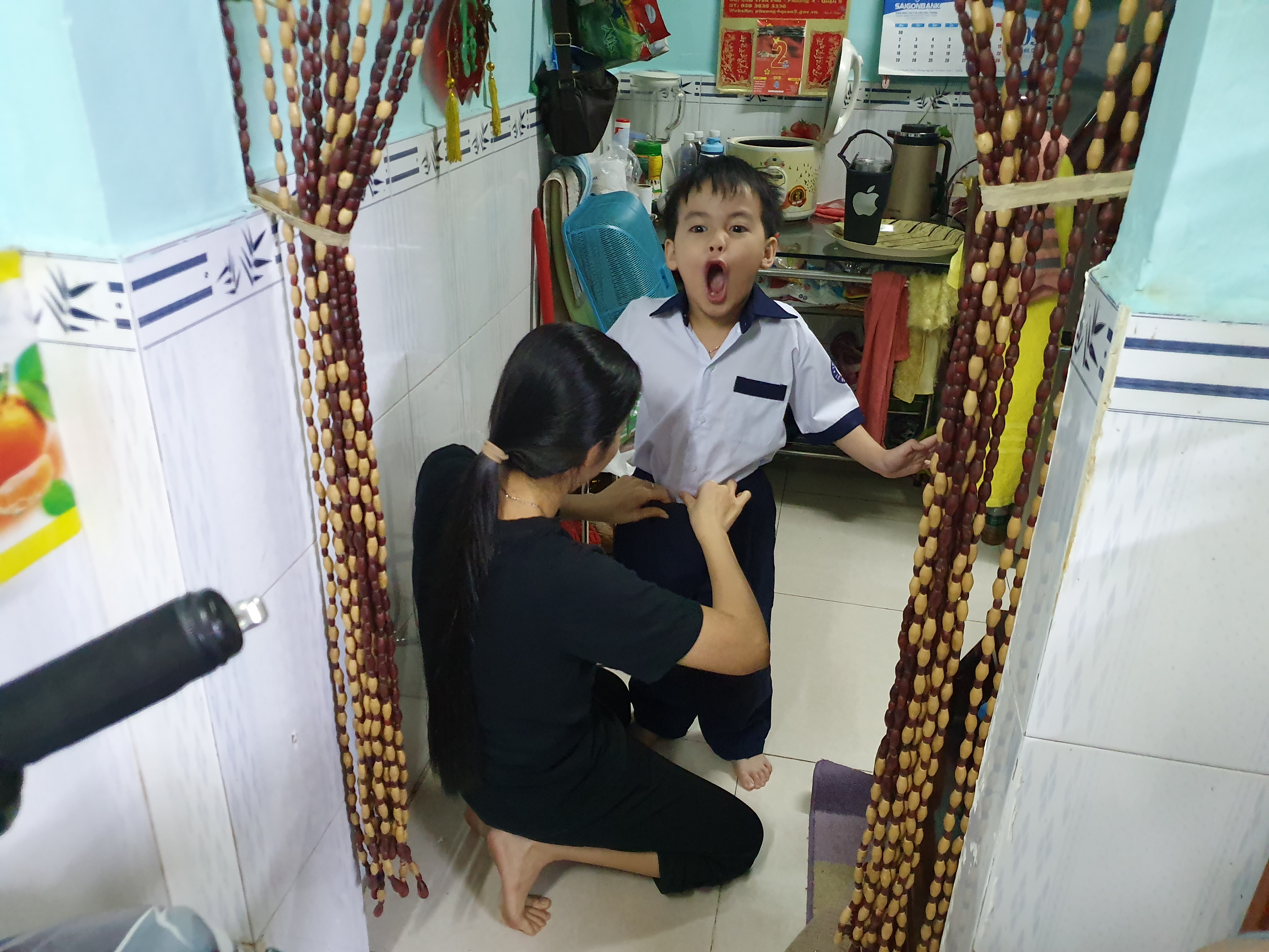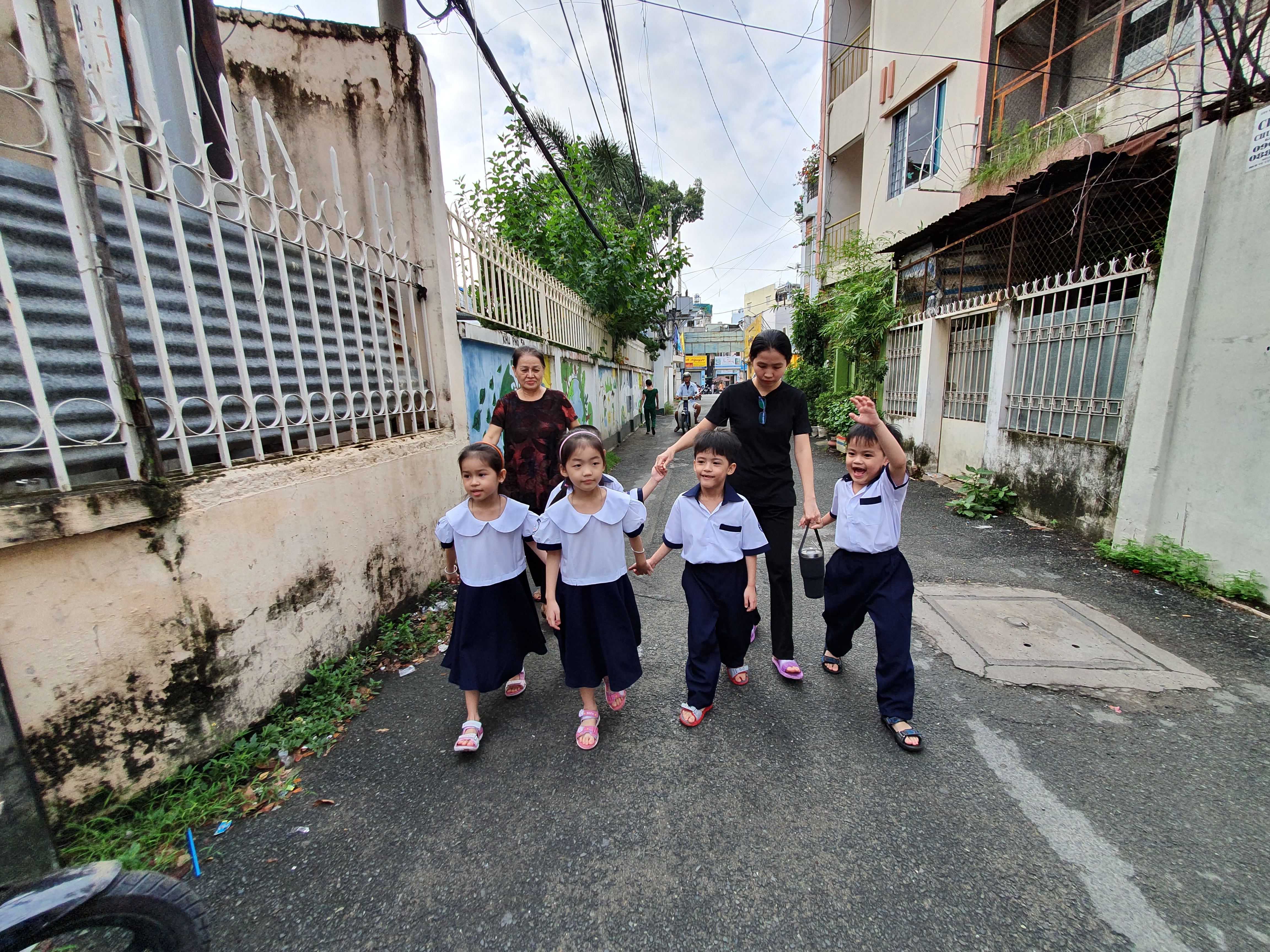 Chị Thư, mẹ của 5 cô cậu bé chia sẻ trong ngày đầu tiên đưa con mình đến trường: “Trước khi vào lớp 1, các em ở nhà được mẹ và bà nội chia nhau ra trông giữ để cha đi làm việc, gia đình không gửi nhà trẻ mà để các em ở nhà tự chăm sóc, quay qua quẩn lại đã hết một ngày”.