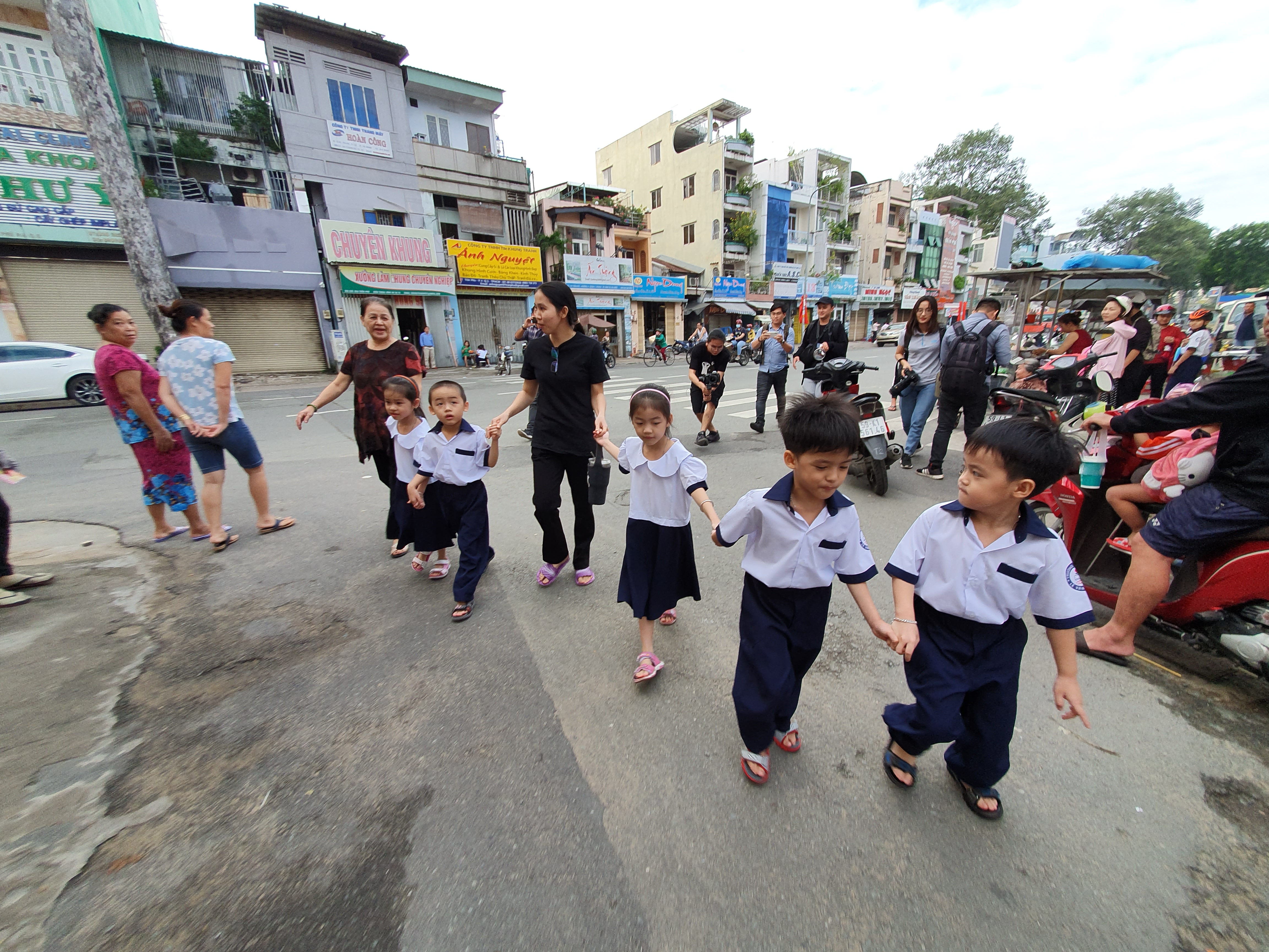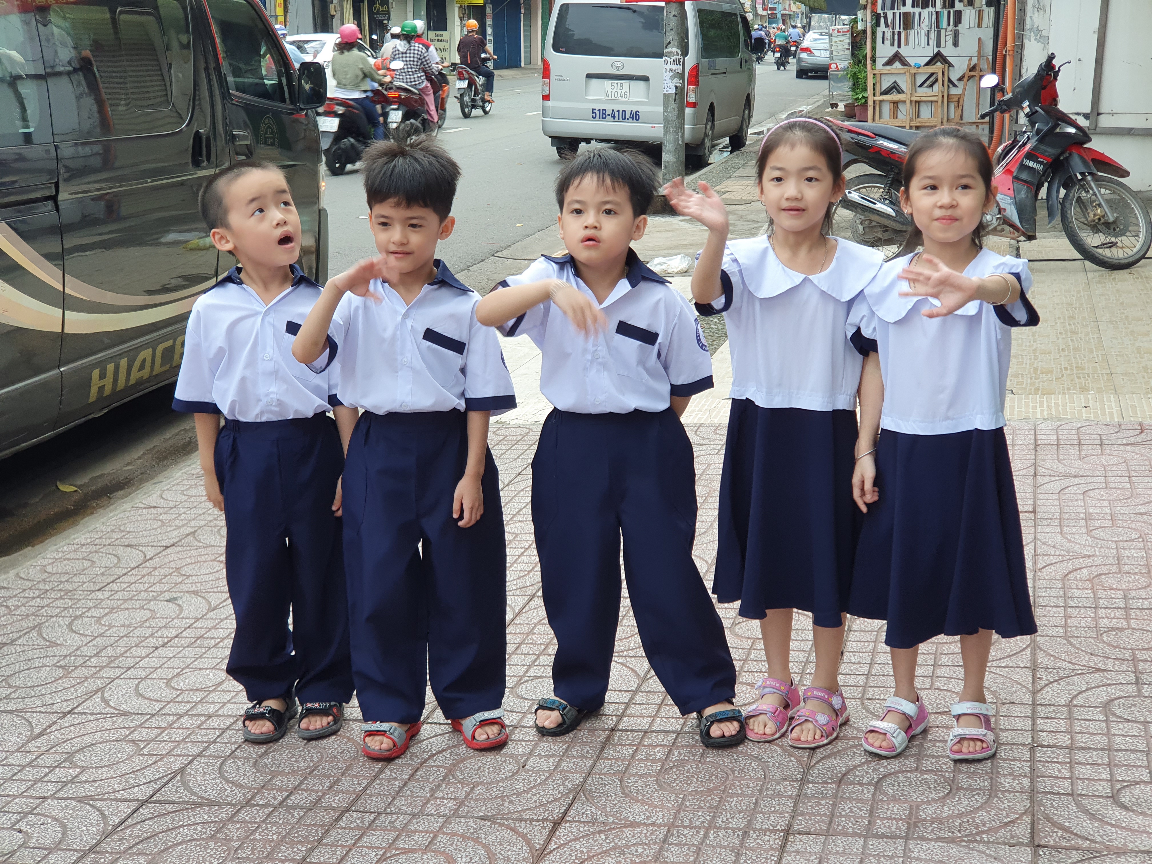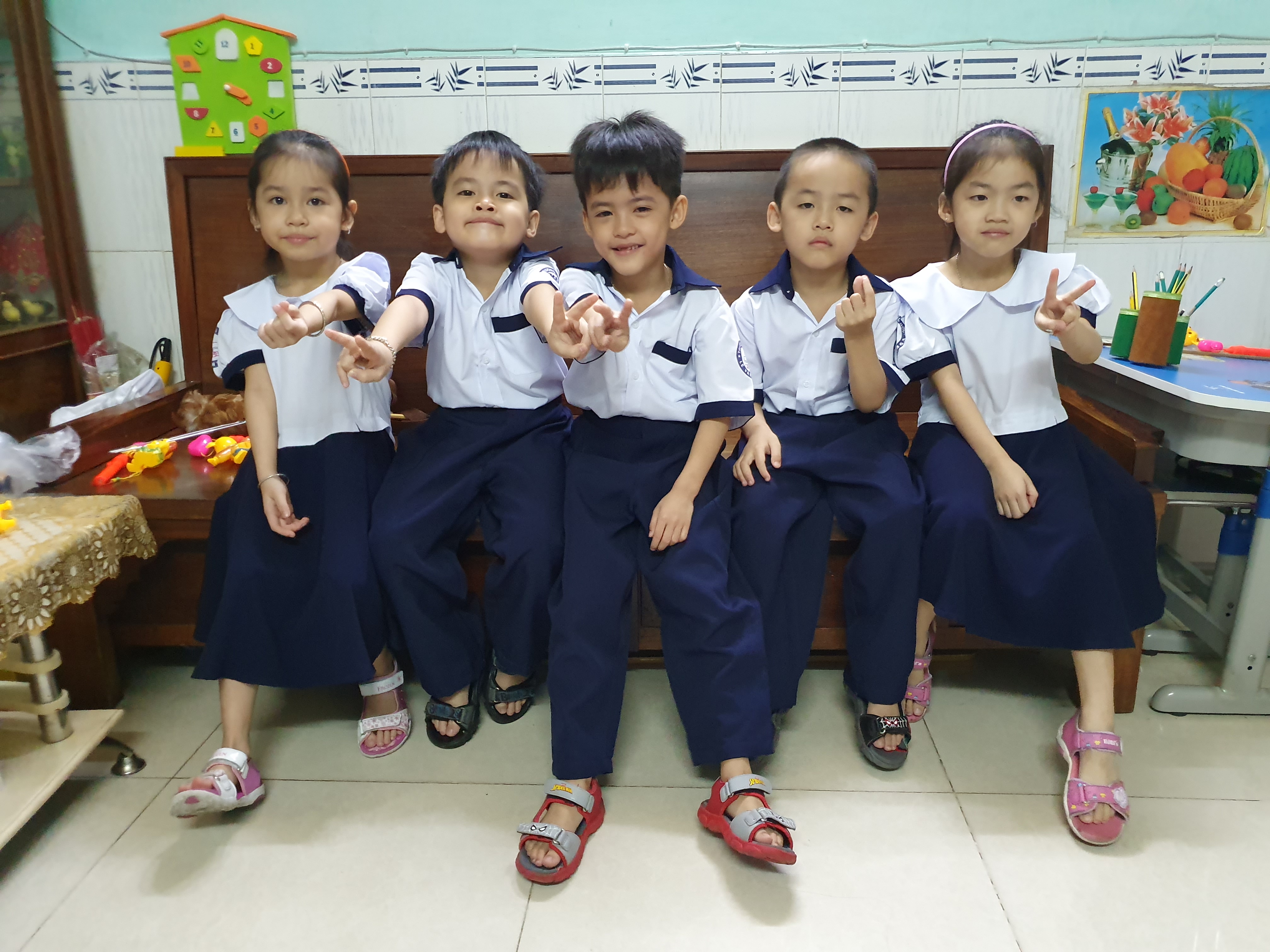 Ngày đầu tiên đi học, cả bà nội và mẹ cùng nắm tay các em dẫn đến trường. Dù ở môi trường mới và ba bé trai, hai bé gái học ở hai lớp khác nhau, nhưng năm anh chị em nhà này luôn cười nói và tỏ ra hòa đồng, không có chút gì là sợ sệt khi gặp bạn bè, thầy cô mới.