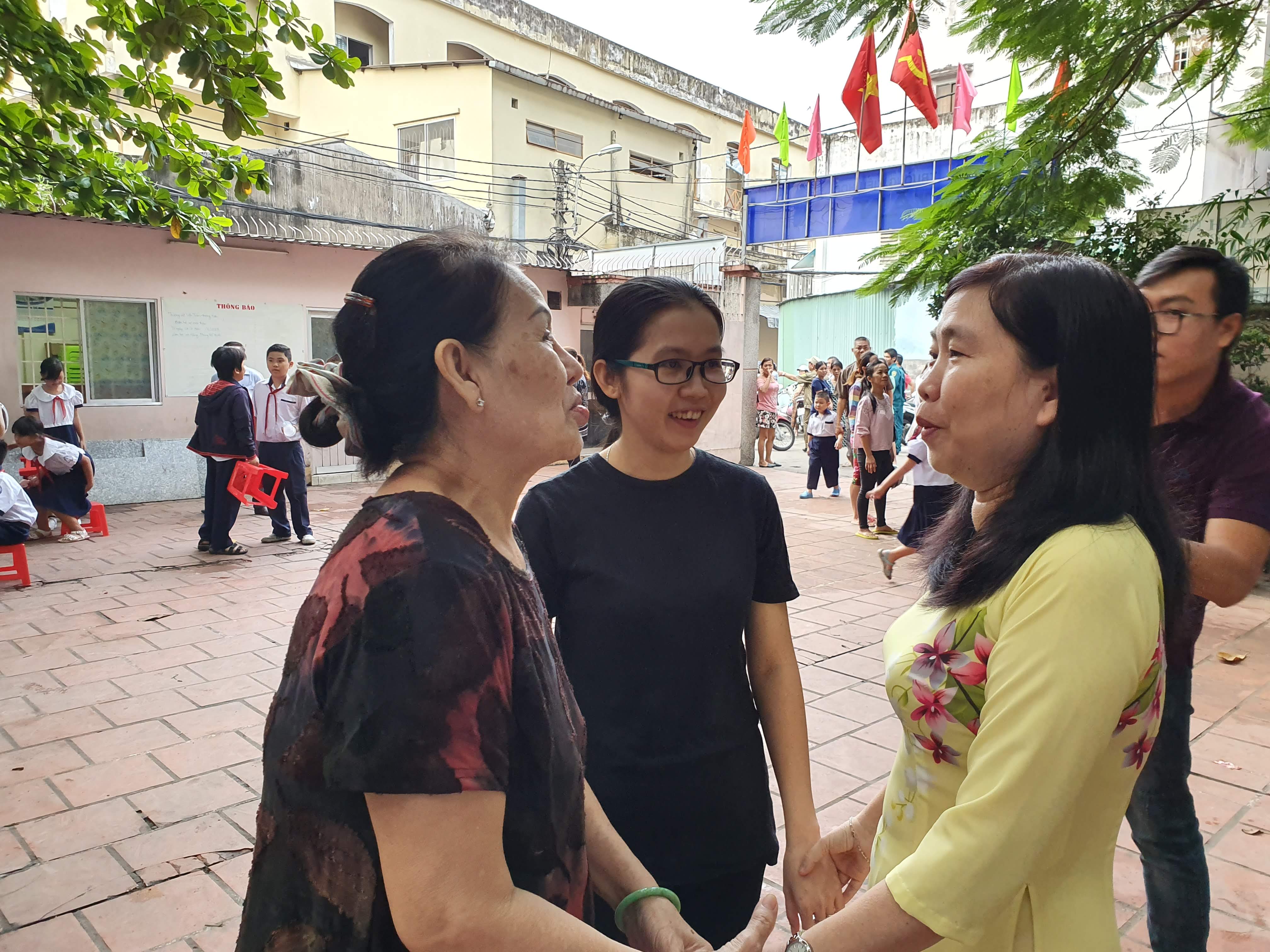 Cô hiệu trưởng trường tiểu học Lê Văn Tám (quận 5) chúc mừng phụ huynh của các bé được theo học tại trường.