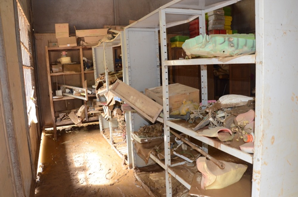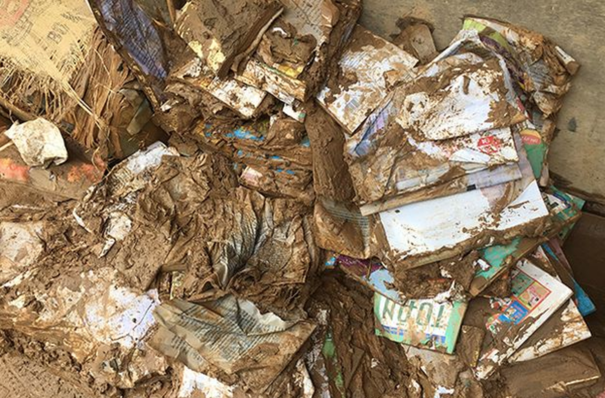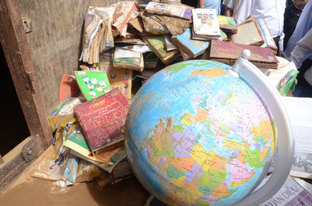 Đồ dùng học tập bị bùn đất làm hư hỏng, không thể sử dụng.