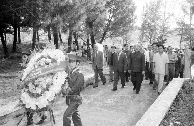 Tổng Bí thư Đỗ Mười đặt vòng hoa viếng các Anh hùng liệt sĩ tại Nghĩa trang liệt sĩ Trường Sơn, tỉnh Quảng Trị (5/3/1993). Ảnh: Xuân Lâm/TTXVN