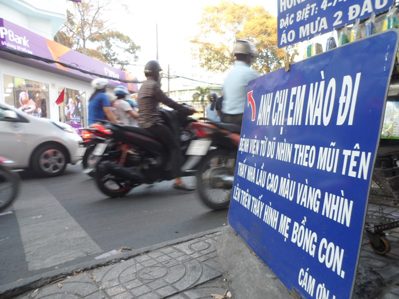 Tấm biển chỉ đường đến bệnh viện Từ Dũ được cóp nhặt từ những đồng tiền lẻ của người đàn ông không biết chữ. Ảnh: NGUYỄN TRÀ.