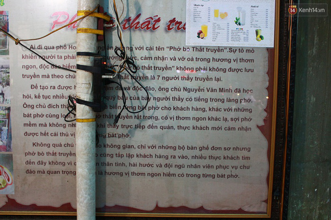 Ông Minh chia sẻ, trước nay người ta cứ vin vào cớ phở là món ăn truyền thống nên quán dù mới mở, chẳng có công thức nấu nướng gì đặc biệt cũng gọi tên “gia truyền” để níu chân thực khách. Chẳng ai dám mạnh dạn tuyên bố quán mình là phở thất truyền, thế nên lúc ông đặt cái tên này, nhiều người thấy lạ lắm. Có lẽ đây cũng chính là lý do ông Minh phải treo ở giữa quán nhỏ một tấm biển, giải thích ngọn ngành lý do vì sao, quán phở của mình lại có một cái tên lạ như thế.