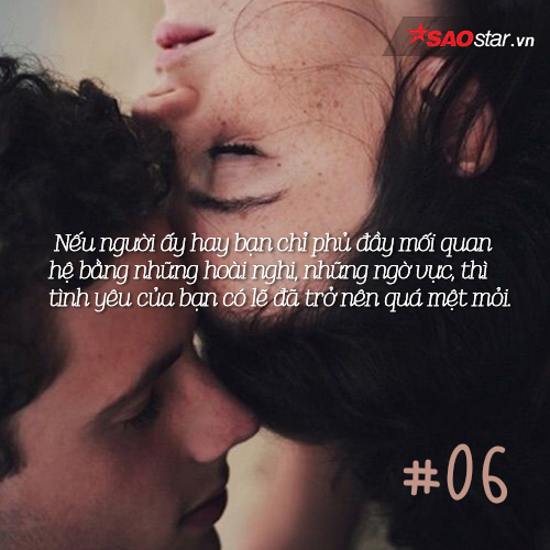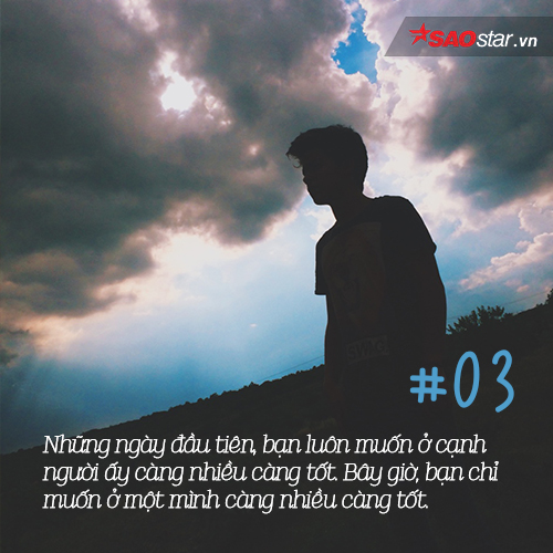 Khi yêu nhau, chúng ta sẽ muốn được ở bên cạnh và dành nhiều thời gian cho đối phương. Nhưng đến một lúc nào đó khi tình yêu đã nguội lạnh, ngồi bên nhau sẽ không còn khiến tim bạn đập nhanh, không nói gì cũng vẫn thấy bức bối và khó chịu, bạn cảm thấy nghẹt thở và muốn được tự do, dành thời gian cho những gì không liên quan đến người ấy, thì cũng là lúc hai bạn nên dừng lại để cân nhắc và suy nghĩ về mối quan hệ này.