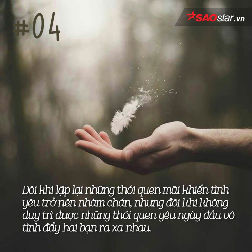 Những cặp đôi yêu nhau lâu thường tạo ra vô vàn những thói quen trong mối quan hệ. Đôi khi lặp lại những thói quen đó mãi khiến tình yêu trở nên nhàm chán, nhưng đôi khi không duy trì được những thói quen yêu ngày đầu vô tình đẩy hai bạn ra xa nhau. Người ấy không còn nói với bạn những lời có cánh, không sốt sắng lo lắng mỗi khi bạn bệnh, không thích đưa bạn đi nhiều nơi như trước, những gì bạn từng làm hoặc từng nhận được giờ đây không còn nữa, thì rõ ràng tình yêu của bạn cũng chẳng như xưa.