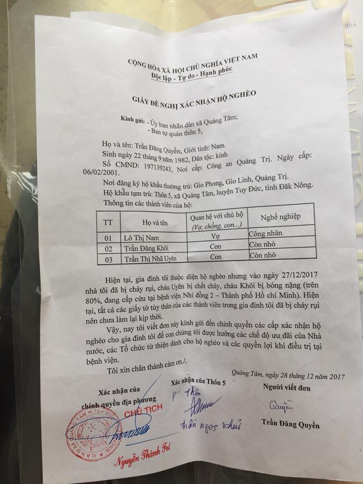 Tất cả đồ đạc, giấy tờ tùy thân của hai vợ chồng đều bị ngọn lửa thiêu rụi. Mới đây, họ hàng, người thân đã giúp anh chị làm lại sổ hộ khẩu và giấy chứng nhận hộ nghèo để giảm bớt chi phí chữa trị cho bé Trần Đăng Khôi.