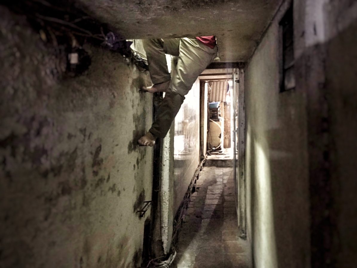Ngồi bệt trong căn nhà nhỏ dài 3m, rộng 2m, cao 1,2m phải bật quạt để tránh sự ngột ngạt. Bốn phía xung quanh là các bức tường cũ kỹ đã bong tróc vữa, ông Xuân phải trèo lên những thanh sắt chữ U tự chế để lên được nhà. Khi đã ở trên, ông dặn khách thăm nhà đừng buông chân xuống dưới kẻo chạm vào đầu người khác đang đi bên dưới.