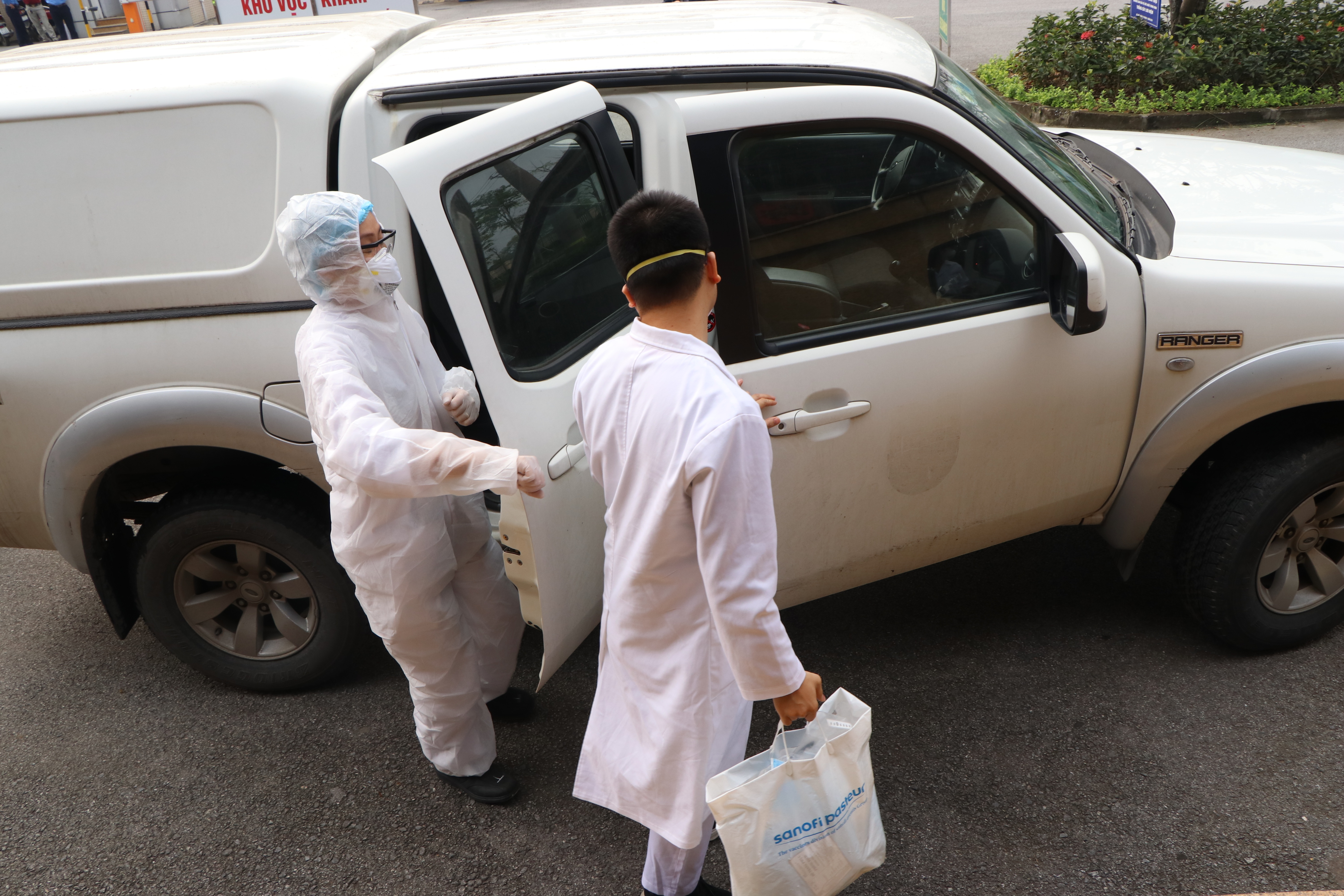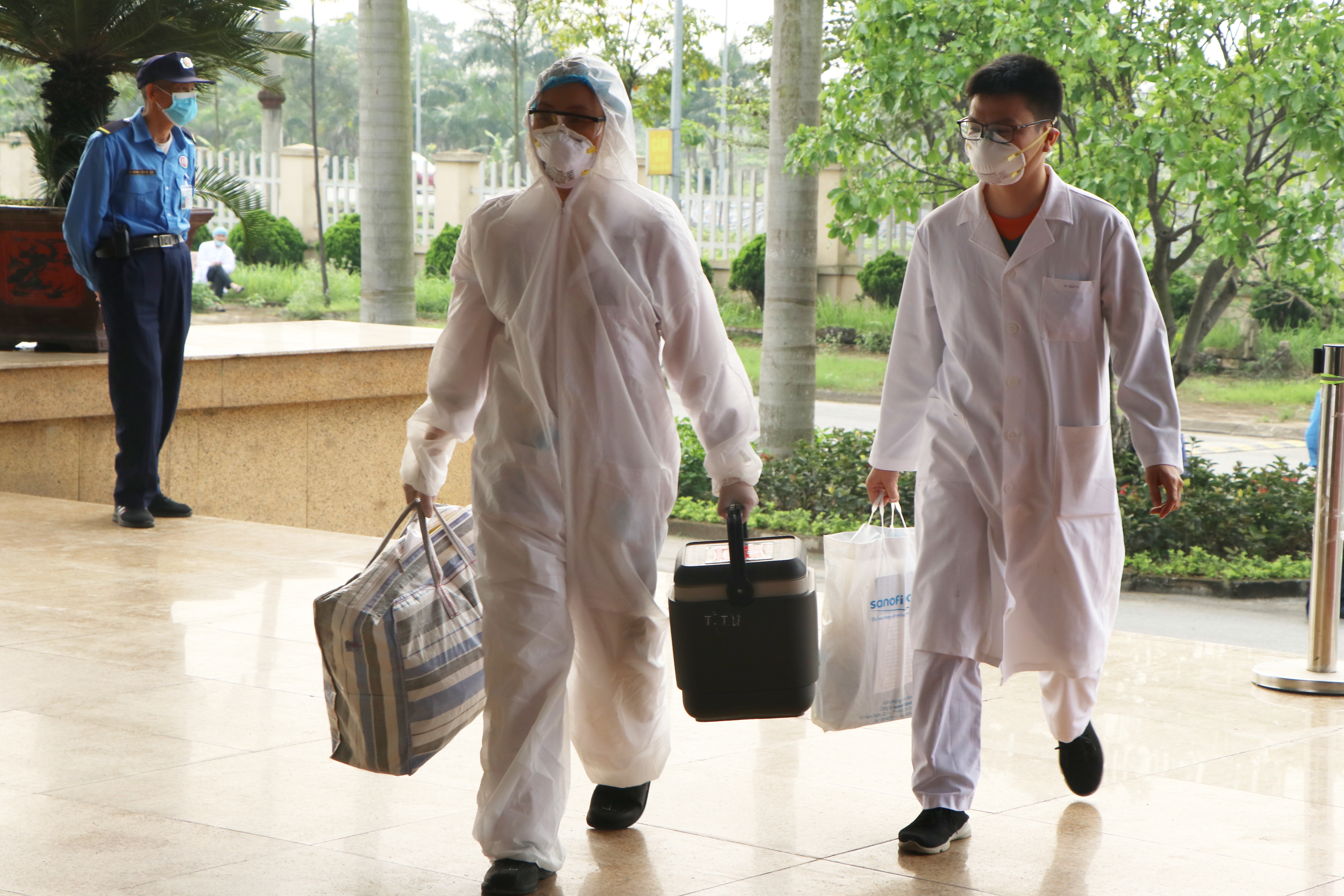 Các y bác sĩ Bệnh viện Nhiệt đới Trung ương đi lấy mẫu xét nghiệm.