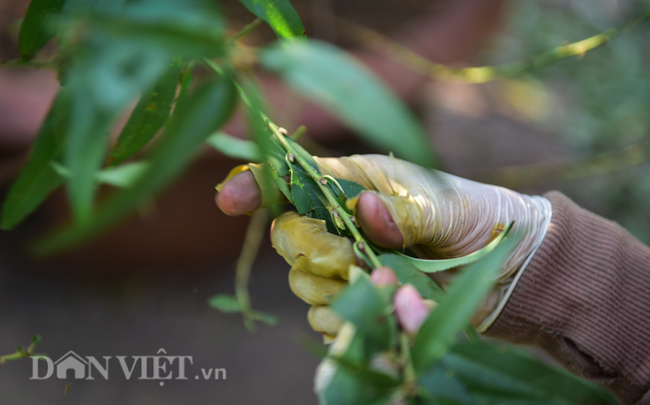 Sau khi tuốt lá, đào ra mắt, người trồng đào sẽ phải bấm ngọn, tuốt lá thêm một lần nữa vào giữa tháng 11 Âm lịch để cây đào tập trung nuôi dưỡng mắt, cho ra những nụ hoa mập mạp và thắm hơn.