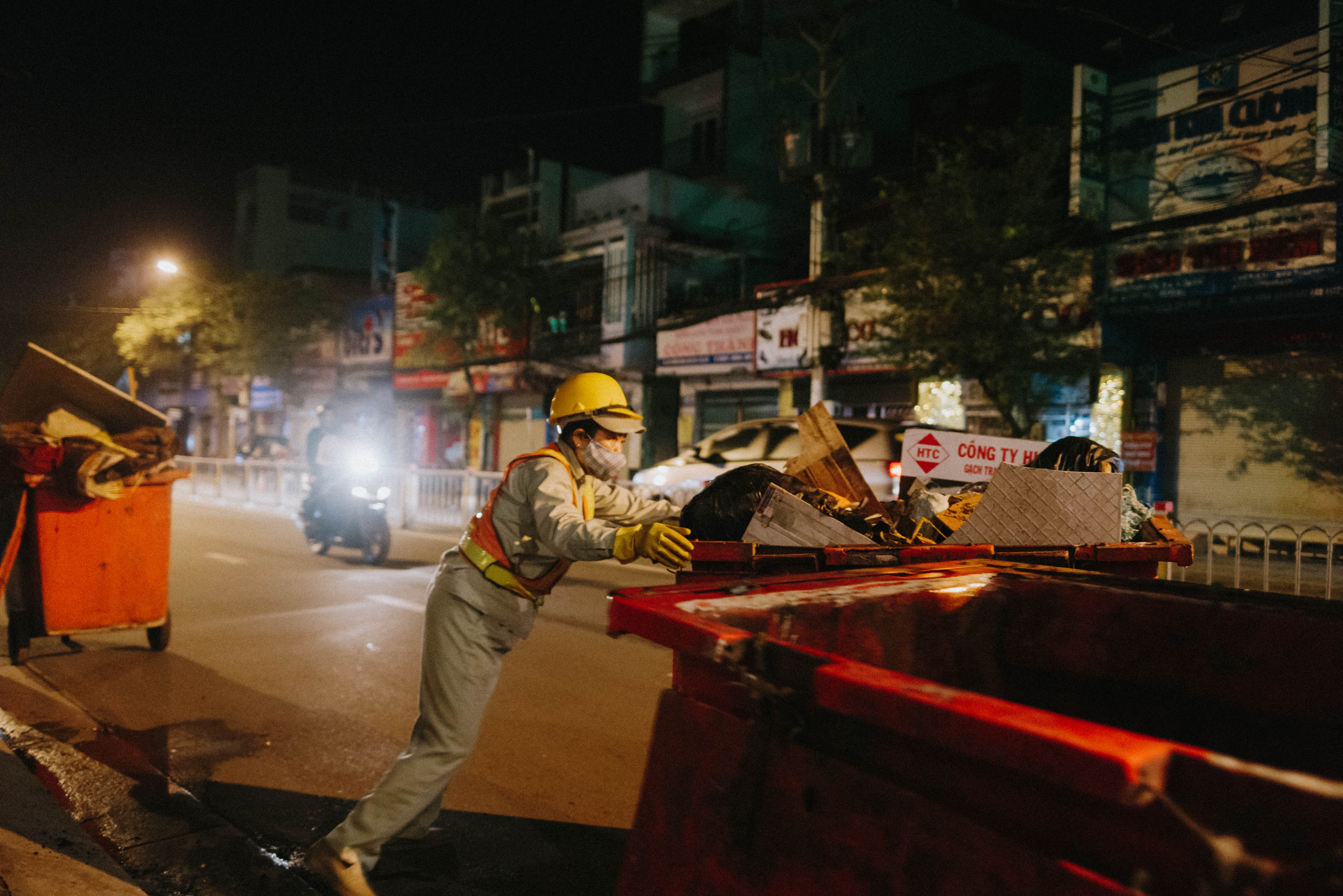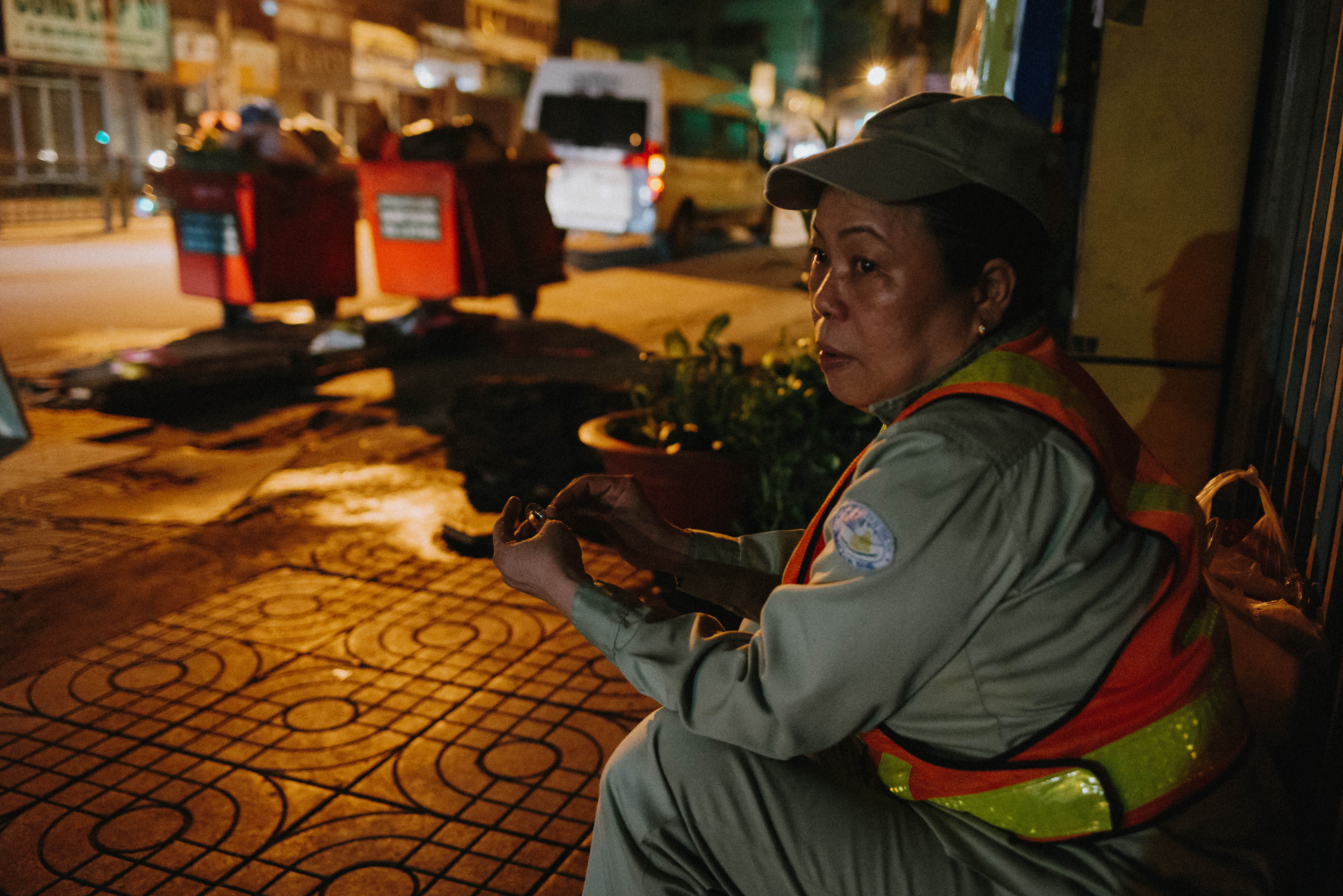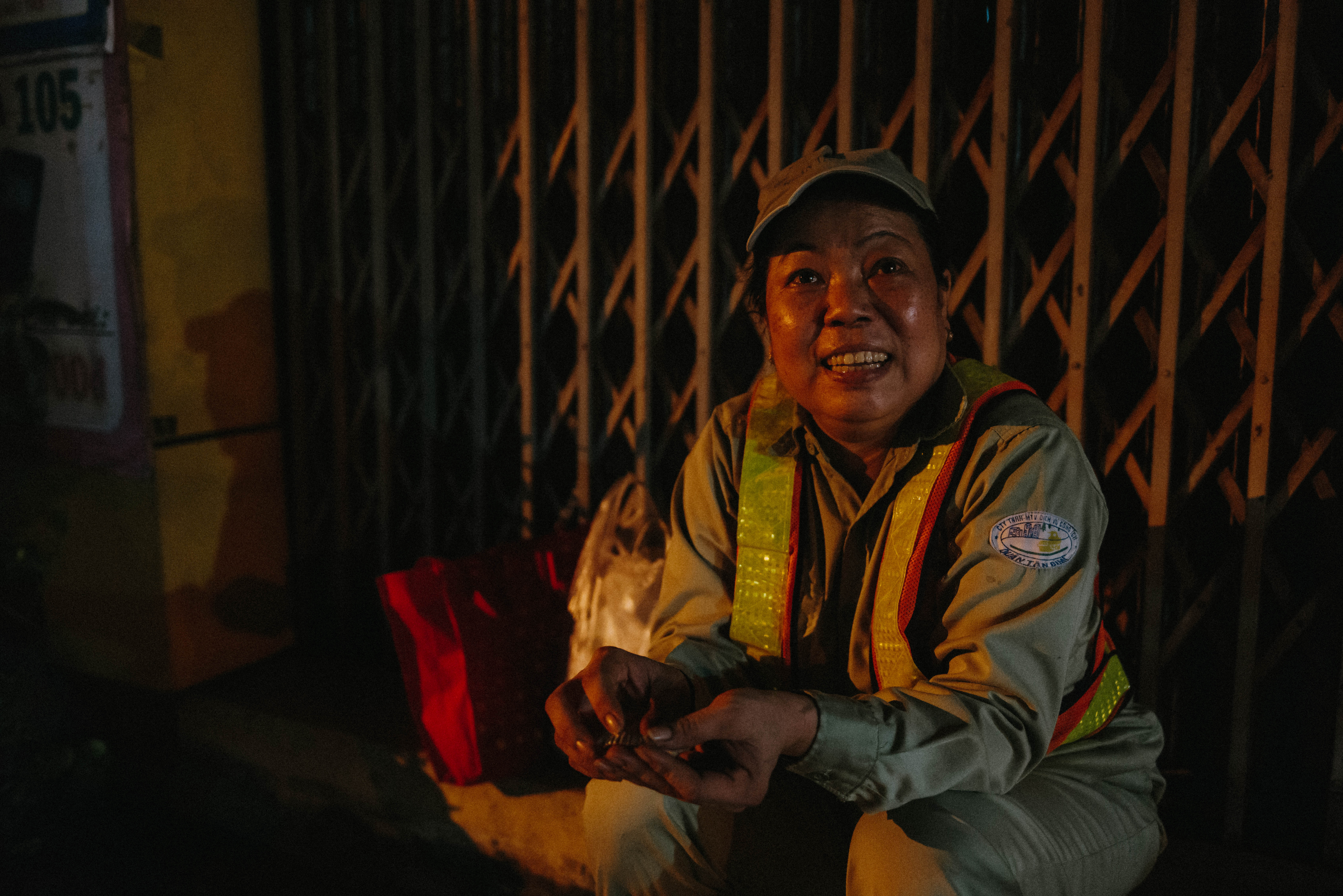 Sau khi đưa rác lên xe ép, cô Hồng sắp xếp chổi, xẻng và các vật dụng cá nhân, sau đó đẩy xe về điểm tập kết, kết thúc ngày làm việc vất vả. Lúc này là 1h khuya. Cô cho biết về nhà ngủ tí chút rồi dậy chuẩn bị cho hội thi “Bình đẳng giới”.