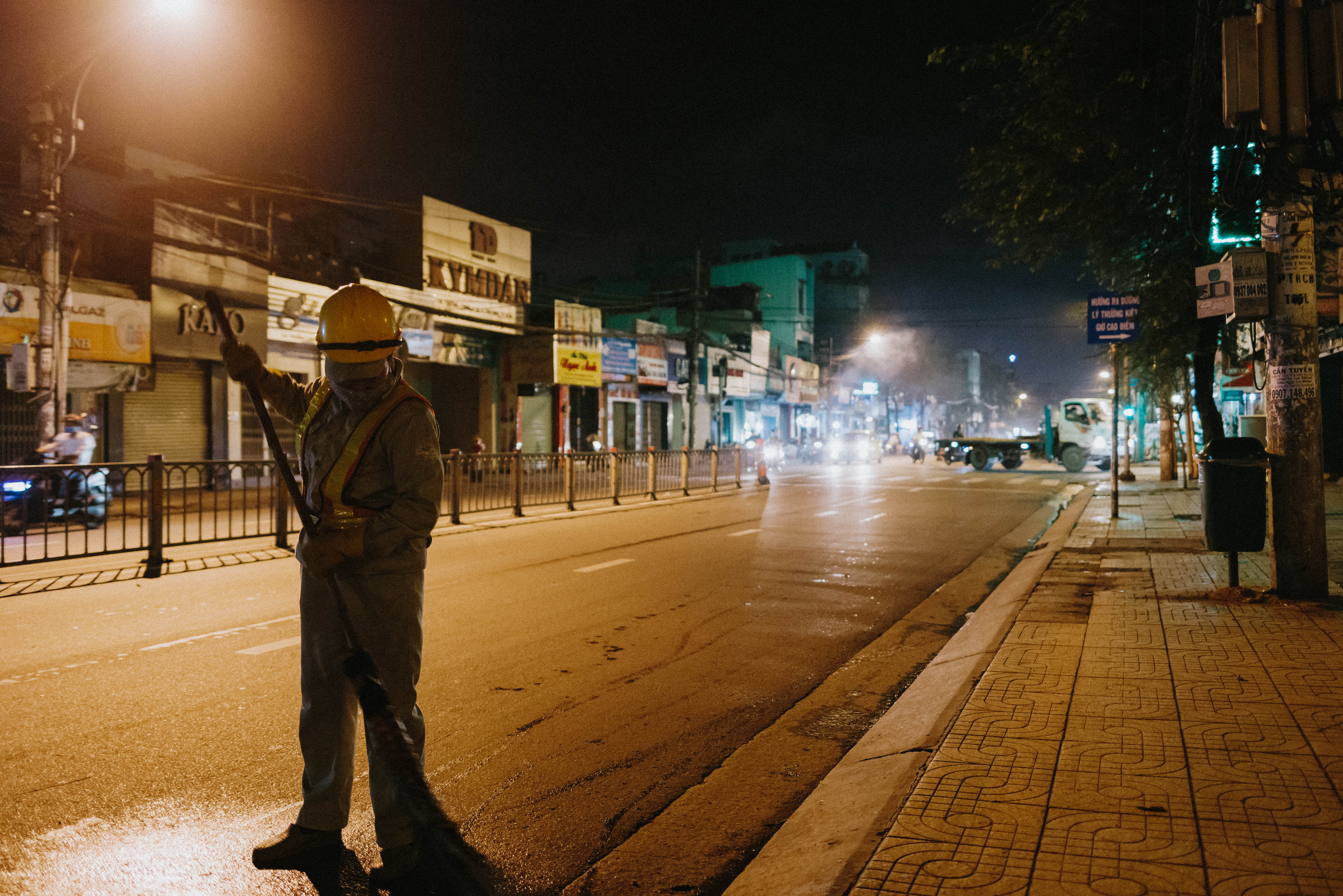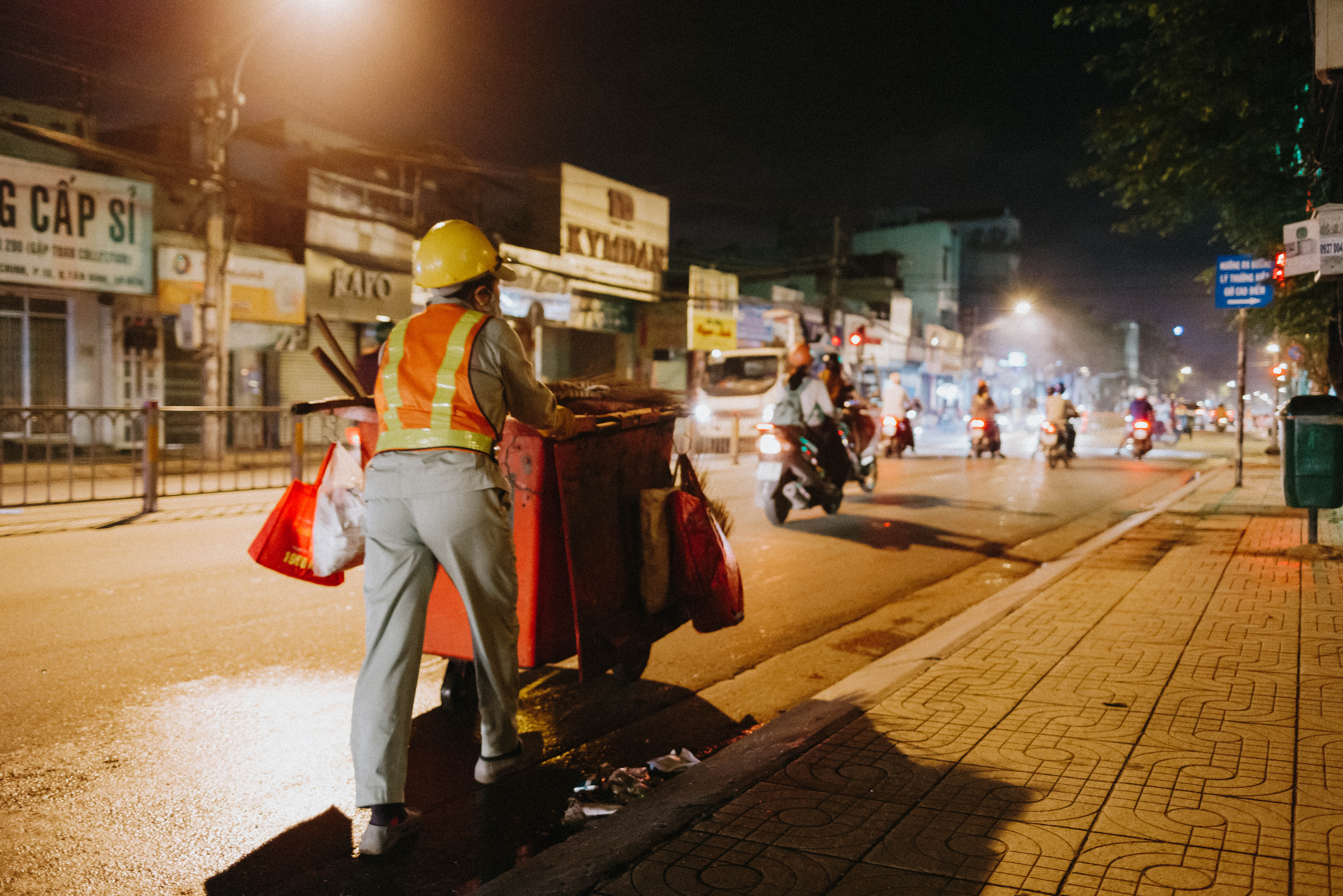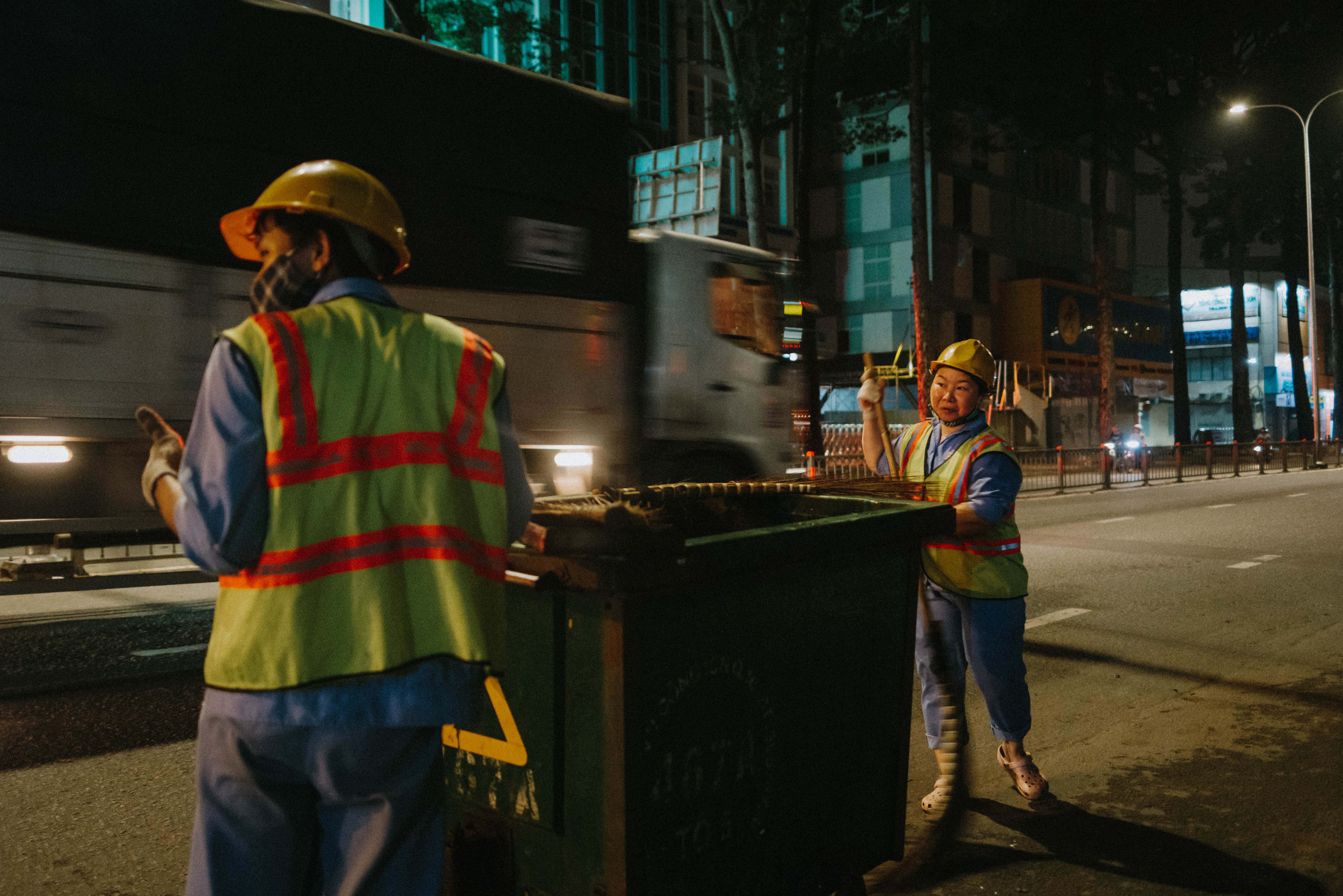Sau khi đưa rác lên xe ép, cô Hồng sắp xếp chổi, xẻng và các vật dụng cá nhân, sau đó đẩy xe về điểm tập kết, kết thúc ngày làm việc vất vả. Lúc này là 1h khuya. Cô cho biết về nhà ngủ tí chút rồi dậy chuẩn bị cho hội thi “Bình đẳng giới”.