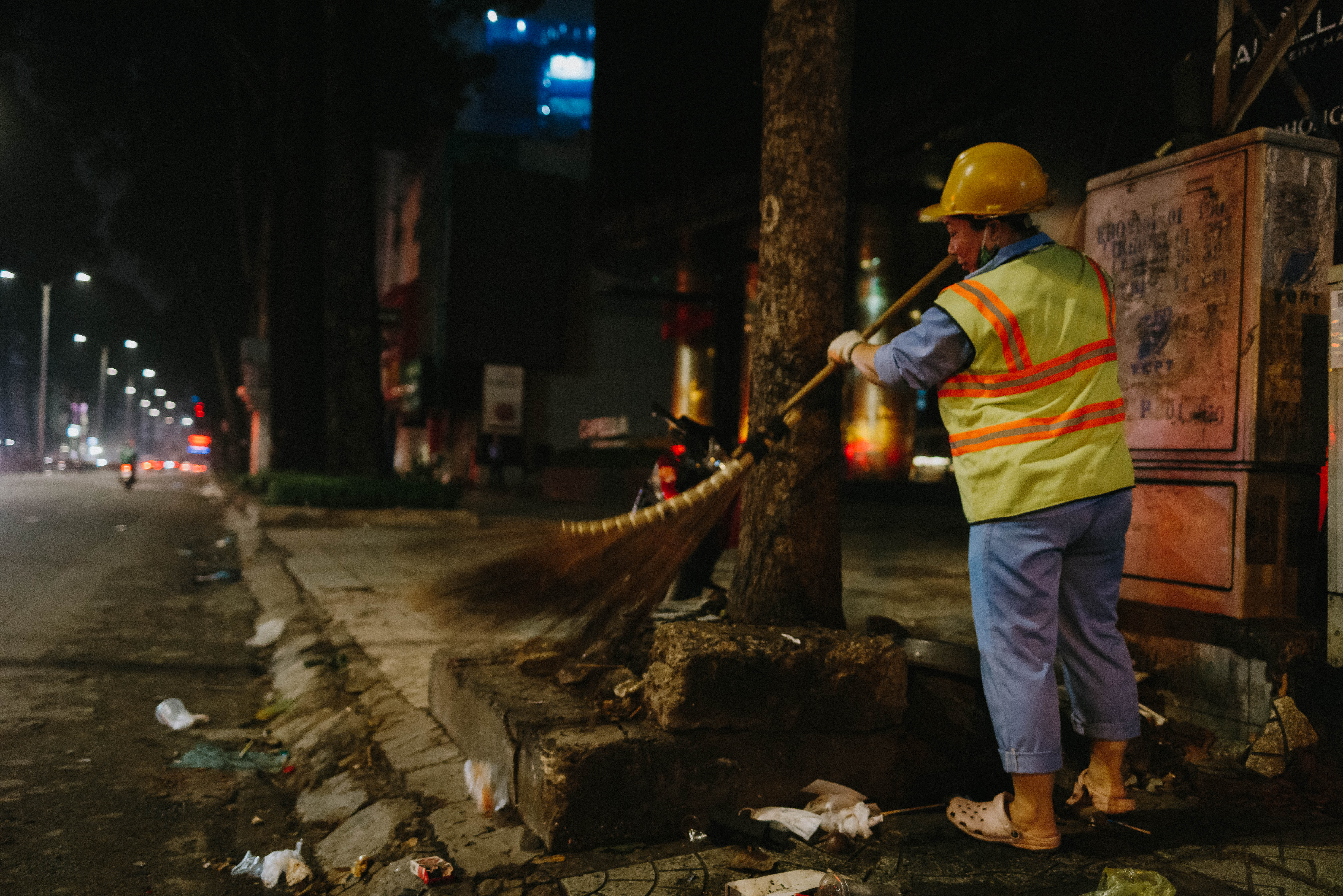 Công việc vệ sinh môi trường nhiều vất vả, lắm gian nan. Ngoài việc dọn dẹp những tuyến phố dài, những công nhân còn phải chú ý đến giao thông để giữ an toàn cho bản thân và người đi đường. “Đầu năm rồi cô cũng mới bị xe đụng, mắt còn vết sẹo đây này. Có đồng nghiệp cô thì mới vừa đi tháo vít do 2 năm trước bị xe đụng luôn, giờ còn chưa đi làm được”, cô Thu (54 tuổi, đang dọn vệ sinh trên đường 3/2, TP.HCM) chia sẻ vào đêm 19/10.