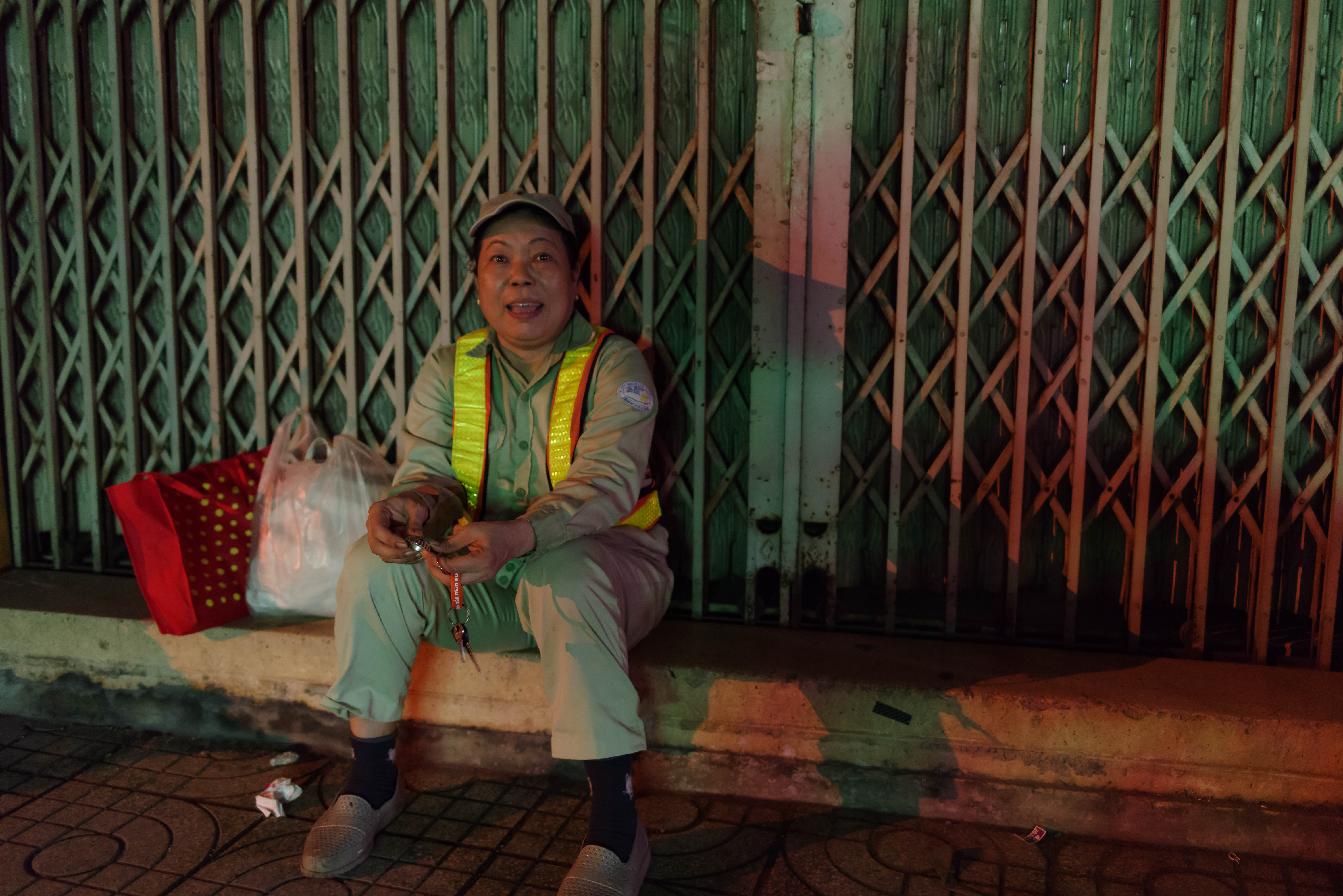 Giống như cô Thu, cô Hồng (48 tuổi, ngụ xã Bà Điểm, huyện Hóc Môn) là một công nhân vệ sinh môi trường của công ty dịch vụ công ích quận Tân Bình. Hàng ngày công việc của cô bắt đầu từ 16h đến 2h hôm sau. Một tuần mỗi người trong tổ của cô phải làm hai ca sáng bắt đầu từ 5h đến 14h.