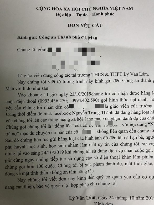 Ngày 25/10, 4 giáo viên vô cớ bị “khủng bố” vì đồng nghiệp nợ tiền đồng ký tên yêu cầu Công an TP.Cà Mau can thiệp, bảo vệ quyền lợi hợp pháp và tư cách người giáo viên.