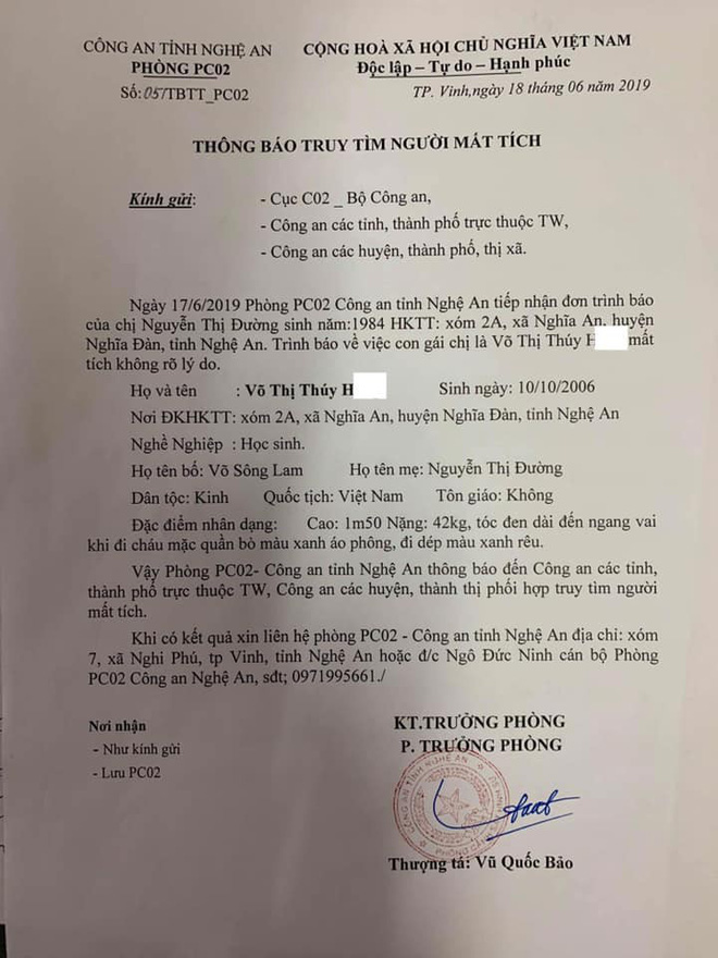 Ngay sau khi nhận được thông tin, Phòng PC 02 Công an tỉnh Nghệ An đã vào cuộc tìm kiếm đồng thời phát thông báo gửi đến công an các tỉnh, thành phố trực thuộc trung ương, công an các huyện, thành thị phối hợp truy tìm cháu H.