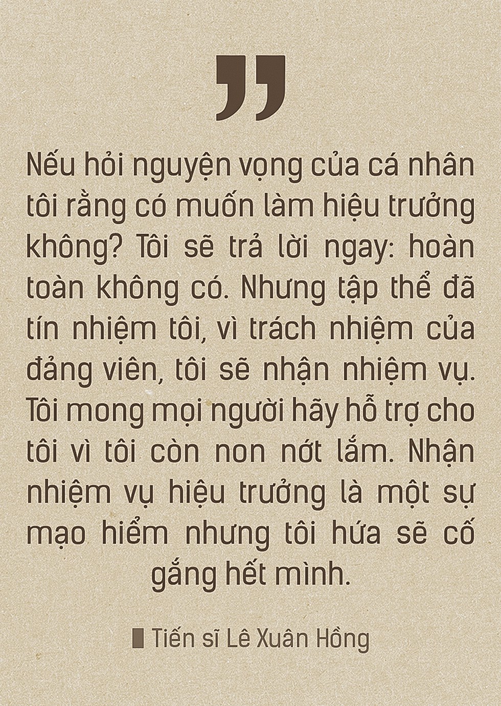 Lúc ấy tôi đã trả lời rằng: “Nếu hỏi nguyện vọng của cá nhân tôi rằng có muốn làm hiệu trưởng không? Tôi sẽ trả lời ngay: hoàn toàn không có.
