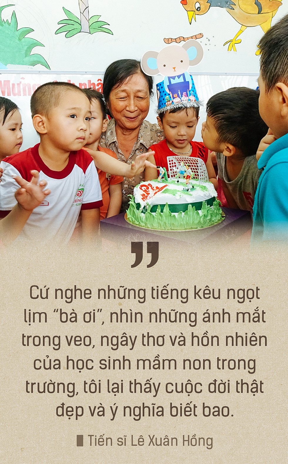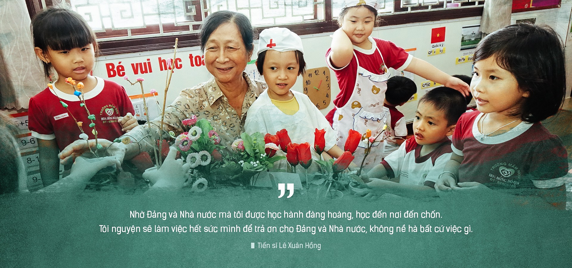 Tôi vừa làm chủ trường vừa làm hiệu trưởng, vất vả đấy nhưng cứ nghe những tiếng kêu ngọt lịm “Bà ơi”, nhìn những ánh mắt trong veo, ngây thơ và hồn nhiên của học sinh mầm non trong trường, tôi lại thấy cuộc đời thật đẹp và ý nghĩa biết bao.