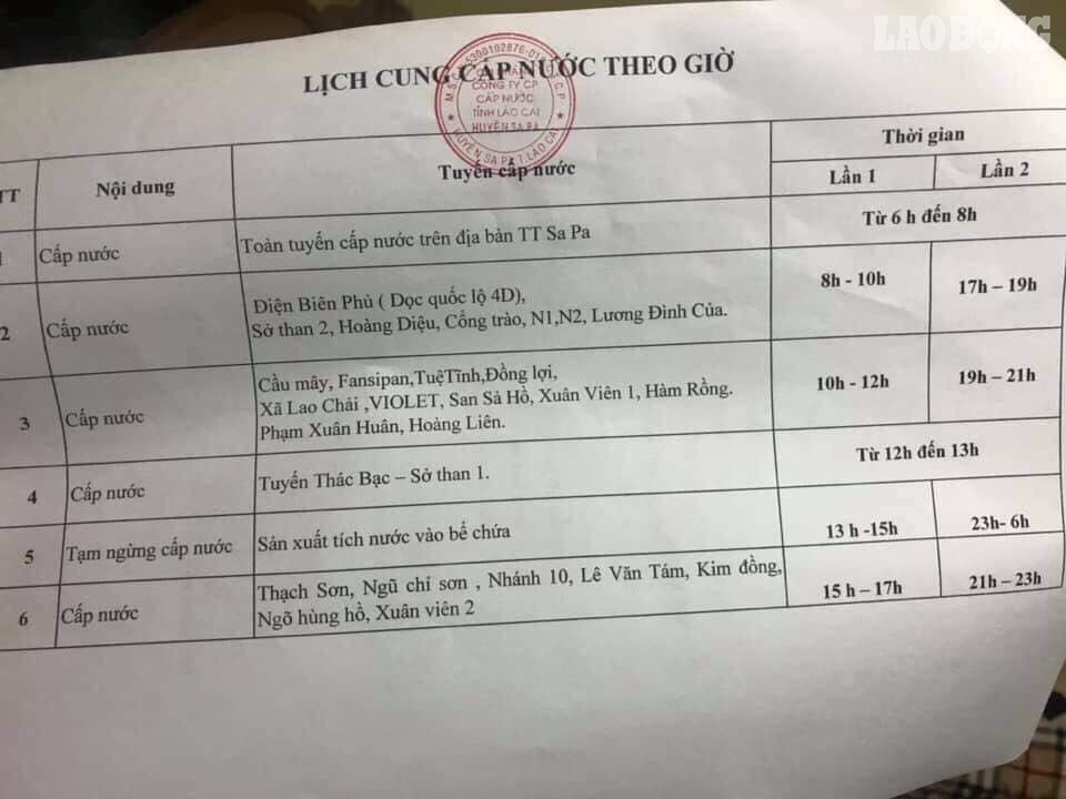 Sáng 24/4, thị trấn cơ bản đã đảm bảo khoảng 70% nhu cầu sử dụng nước cho người dân. Những nơi chưa có nước, UBND thị trấn Sa Pa đã thành lập tổ công tác hỗ trợ nước miễn phí cụ thể là 3 xe chở téc nước (xe khoảng 3 khối, 9 khối) cung cấp cho những nơi nước chưa chảy đến.