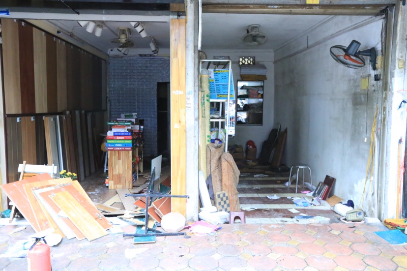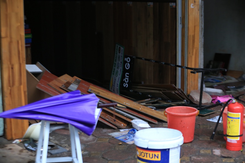 Nhiều đồ gỗ nhà dân bày bán trên phố Đê La Thành không kịp đưa ra ngoài.