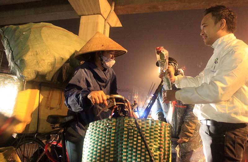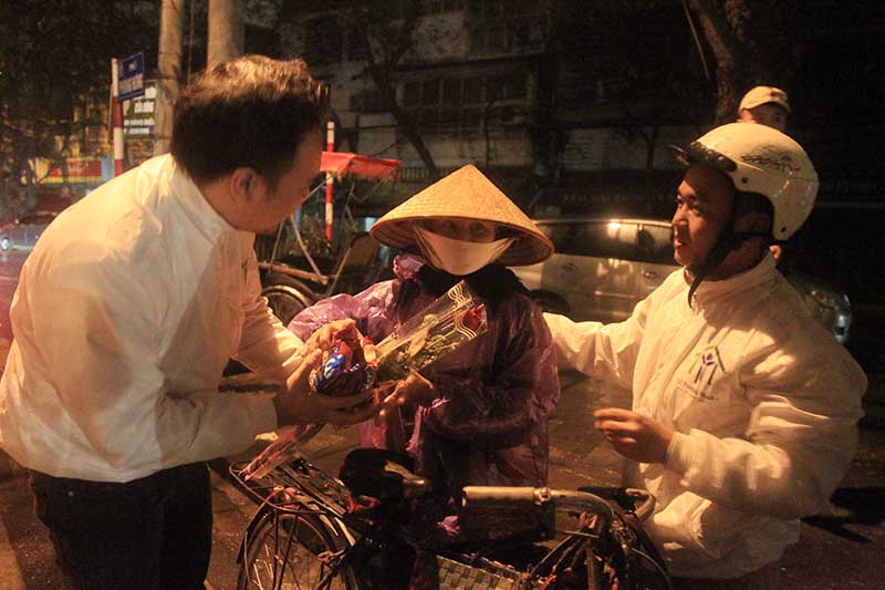 22 giờ đêm ngày 7/3, bất chấp cơn mưa phùn cùng gió rét, nhóm bạn trẻ bắt đầu xuất phát mang theo nhiều phần quà để trao tặng tận tay những phụ nữ lao động. Trong ngày 8/3, con số sẽ lên tới là 5.000 bông hồng.