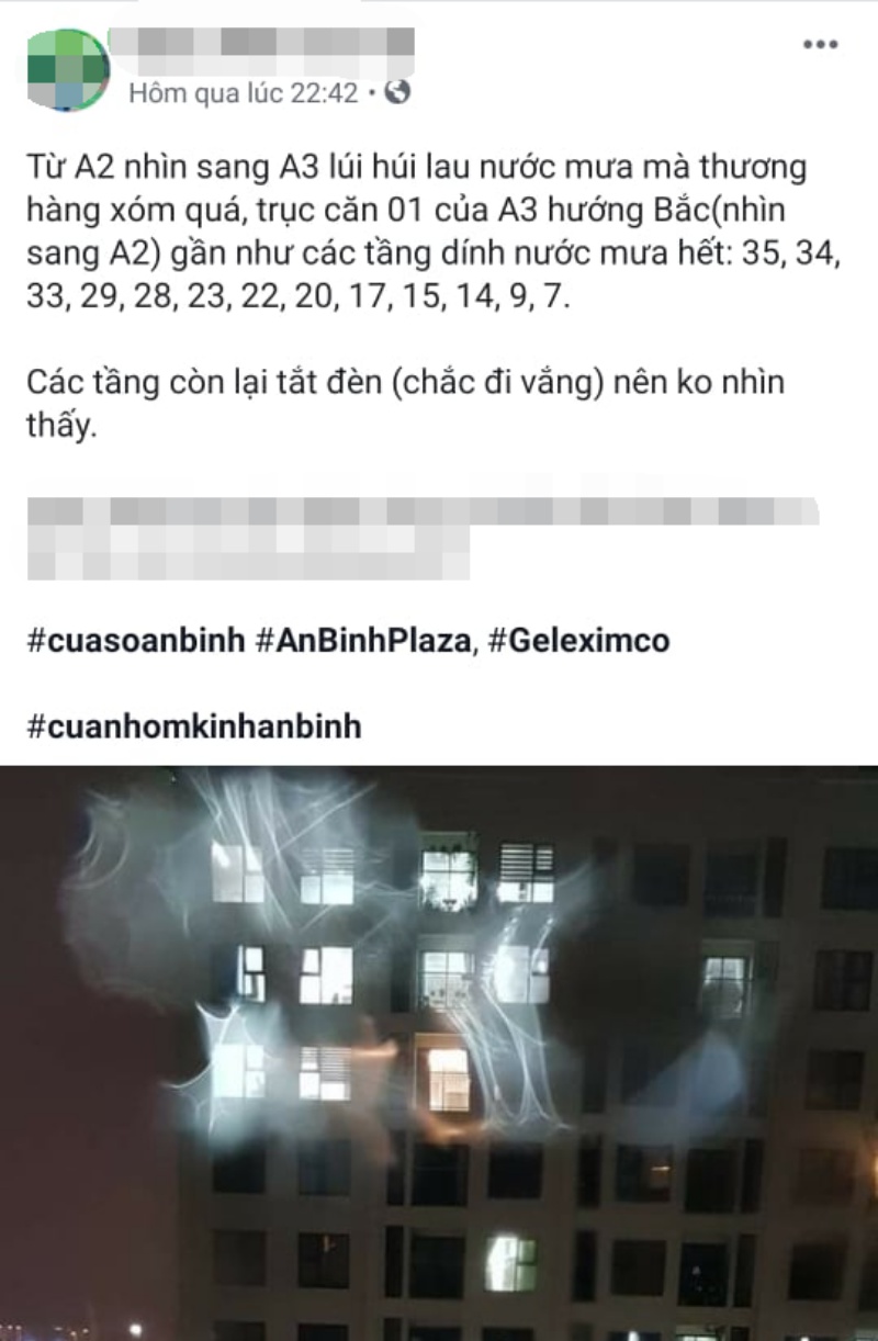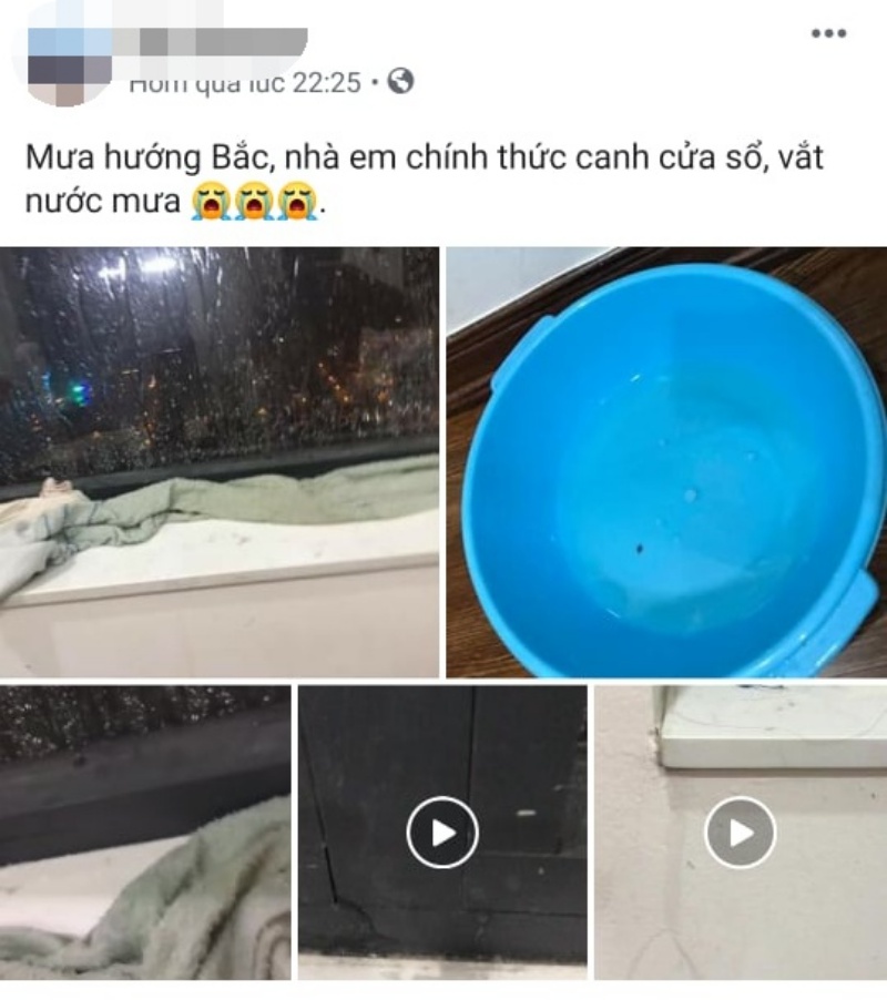 “Mưa hướng Bắc nhà em chính thức canh cửa sổ, vắt nước mưa”, một cư dân chia sẻ hình ảnh nước mưa thấm qua cửa. Chị M.T. ở toà nhà A3 chia sẻ: “Mưa như trút nước và nửa đêm phải dậy chống lụt trong nhà, 3 phòng ngủ đều bị nước ngấm qua cửa sổ và kính, tràn lênh láng vào nhà. Nước chui từ các gầm giường ra. Sàn gỗ hay giường gỗ chắc đi tong”.