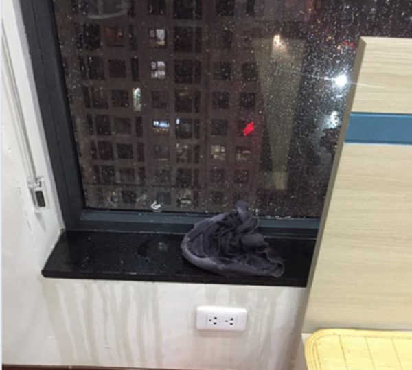 Chia sẻ với chúng tôi chị T.M. ở toà A5 cho biết, chị mới nhận căn hộ cách đây gần 4 tuần với giá 3 tỷ đồng. Đêm ngày 15/8 vừa qua Hà Nội xảy ra mưa lớn khiến nước mưa chảy qua khe cửa kính tràn vào nhà chị rất nhiều. Lúc này chị M. đã phải liên tục dùng khăn thấm nước. Sau sự việc chị M. cũng đã báo với Ban quản lý toà nhà và nhận được phản hồi.
