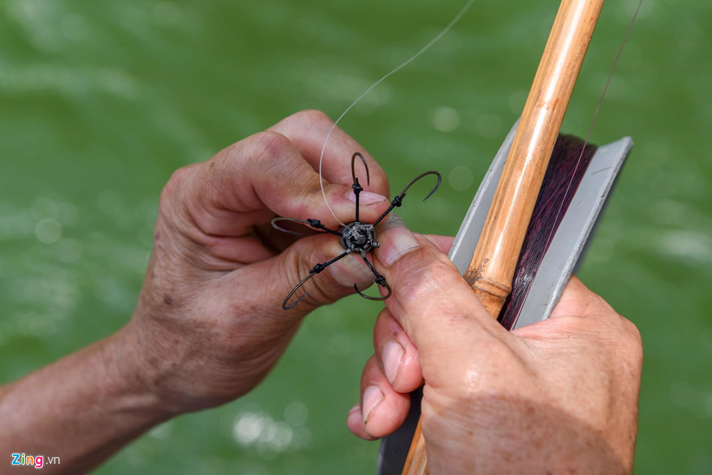Do nước chảy xiết nên các cần thủ phải sử dụng loại lưỡi lục được kẹp cùng phao và thả xuôi theo dòng nước sau đó giật cần liên tục để bắt cá.