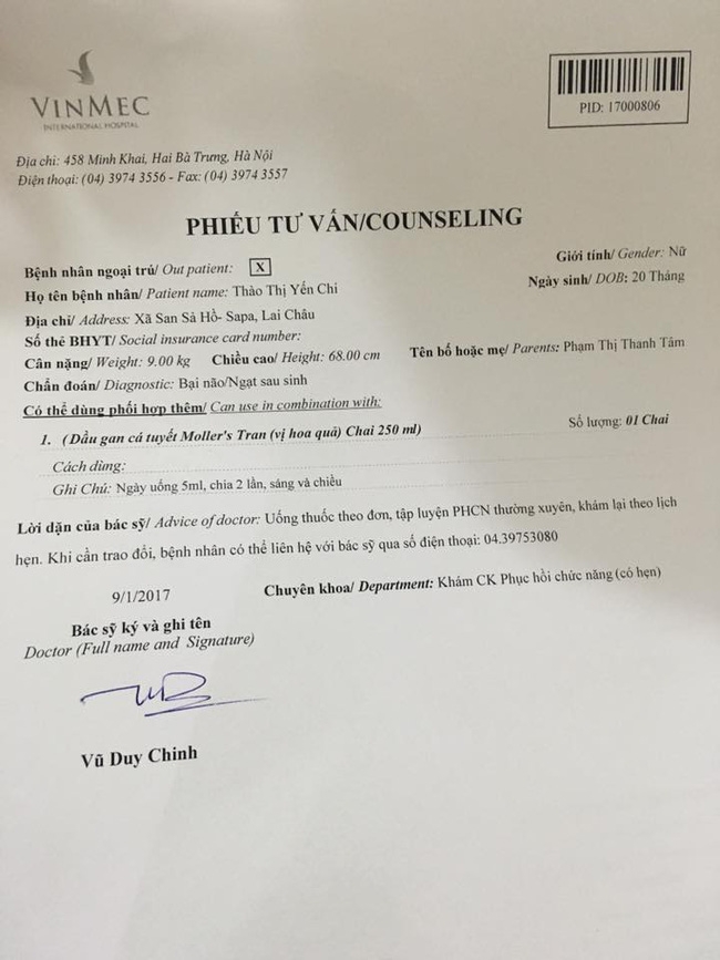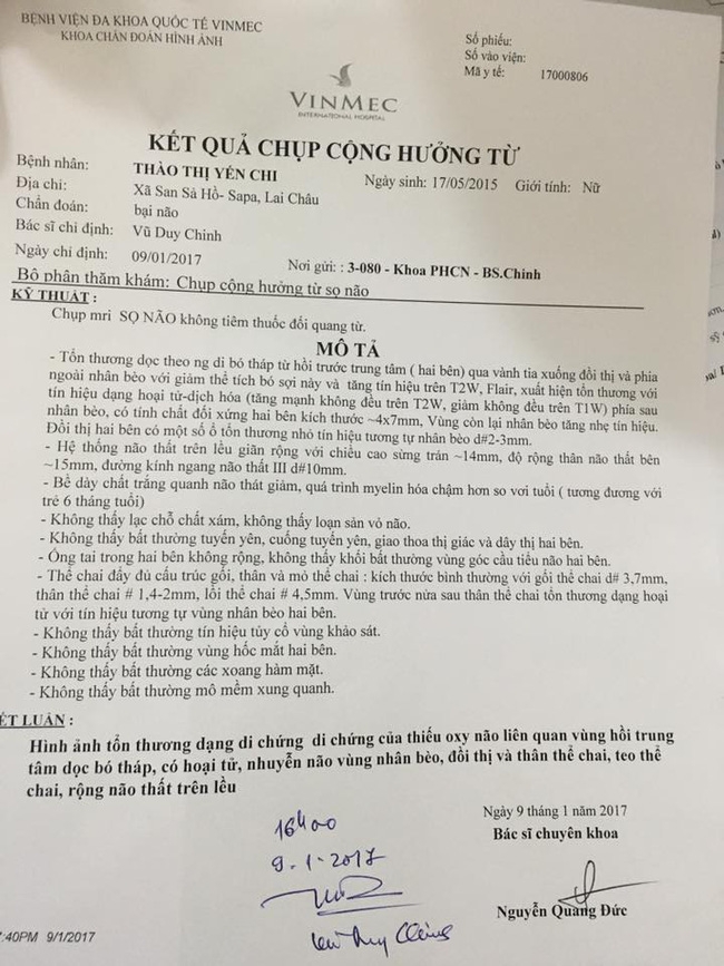 Ngày 9/1/2017 đưa con đi khám tại Vinmec, chẩn đoán bệnh, chụp chiếu đưa ra phương án về việc cấy tế bào gốc.