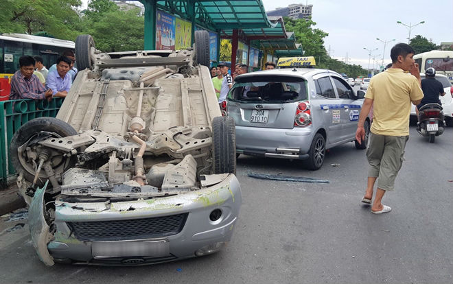 Sau khi tông đổ hàng rào chắn ở khu vực nhà chờ, chiếc xe này bị lật rồi đập vào taxi mang BKS 30A - 910xx khiến cả 2 xe đều bị hư hỏng. Rất may vụ tai nạn không gây thiệt hại về người.