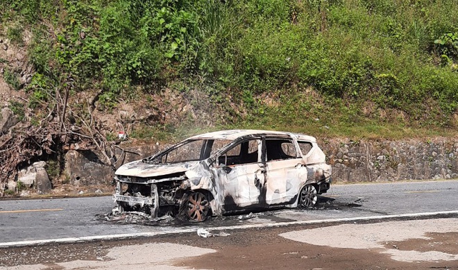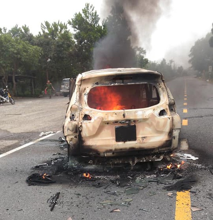 Nhận tin báo, lực lượng chức năng đến hiện trường thì phát hiện chiếc xe bị cháy gần như trơ khung, 2 người ngồi trong xe (chưa rõ danh tính) đã tử vong.