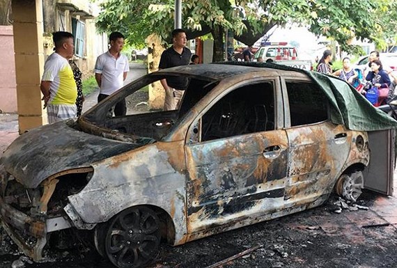 Chiếc xe Kia Morning của Đại úy Duy bị cháy trơ khung. Ảnh: VTC News.