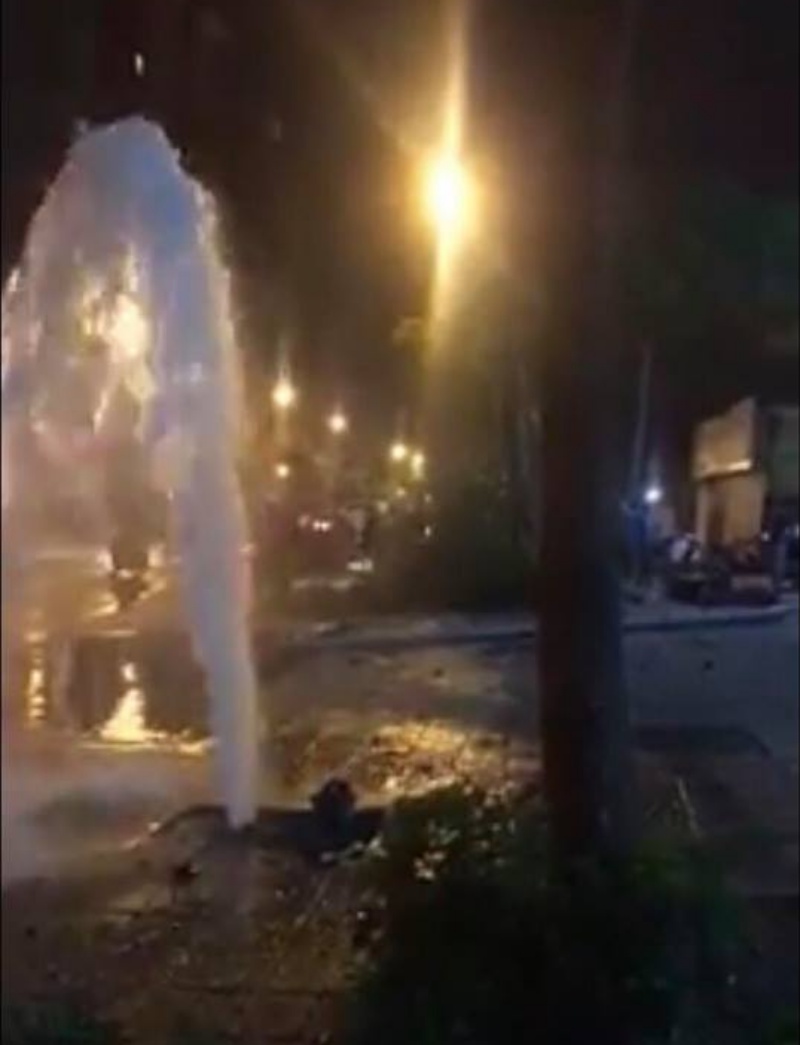 Trụ nước cũng bị gãy đổ khiến nước bắn tung toé.
