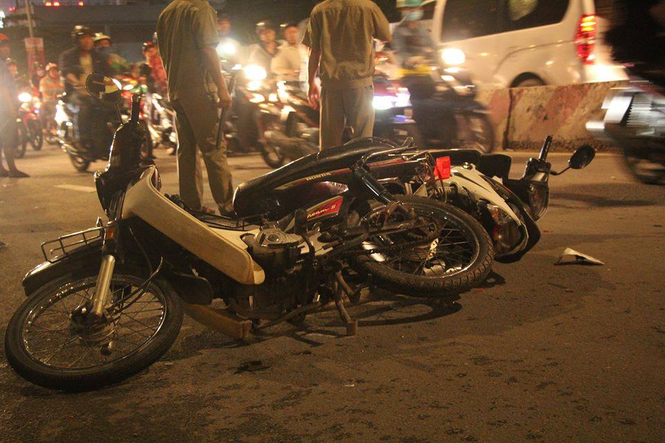 Tại hiện trường 4 xe máy bị hư hỏng, nằm la liệt trên đường, ô tô “điên” bị hư hỏng nhẹ, giao thông qua khu vực gặp nhiều khó khăn.