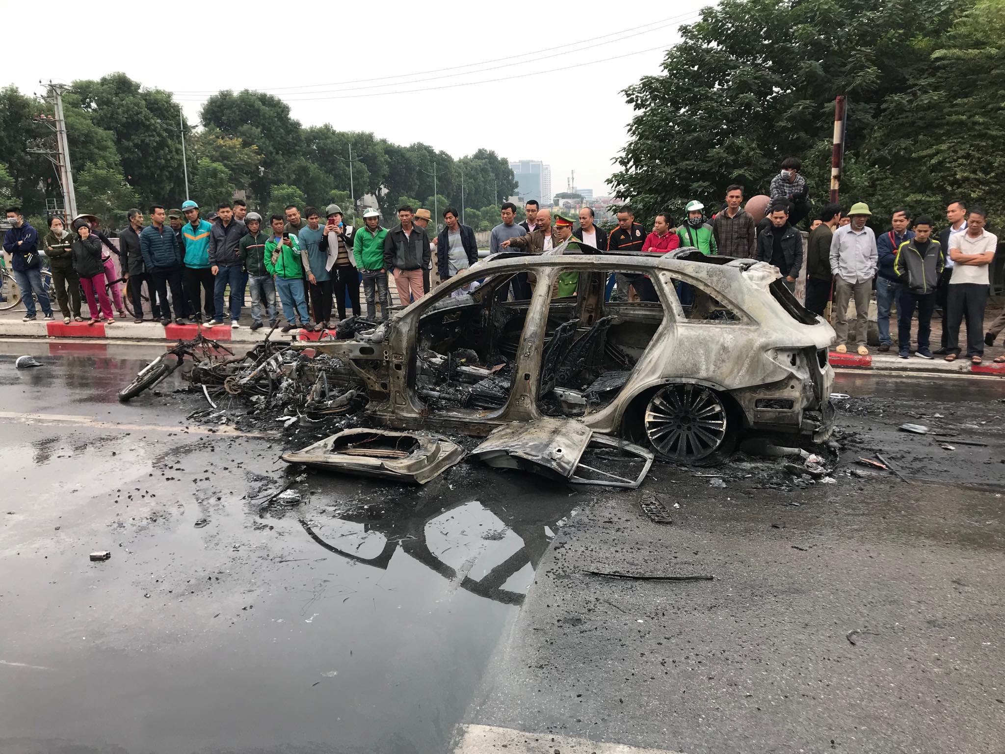 Sau vụ tai nạn, chiếc xe máy nằm gọn trước đầu xe Mercedes và chiếc xe ô tô nhãn hiệu hạng sang này bất ngờ bốc cháy dữ dội. Ngay sau khi phát hiện sự việc, người dân và tài xế đã tìm cách dập lửa nhưng do ngọn lửa ngày càng bùng phát nhanh chóng nên chỉ trong ít phút đã bao trùm toàn bộ chiếc xe.