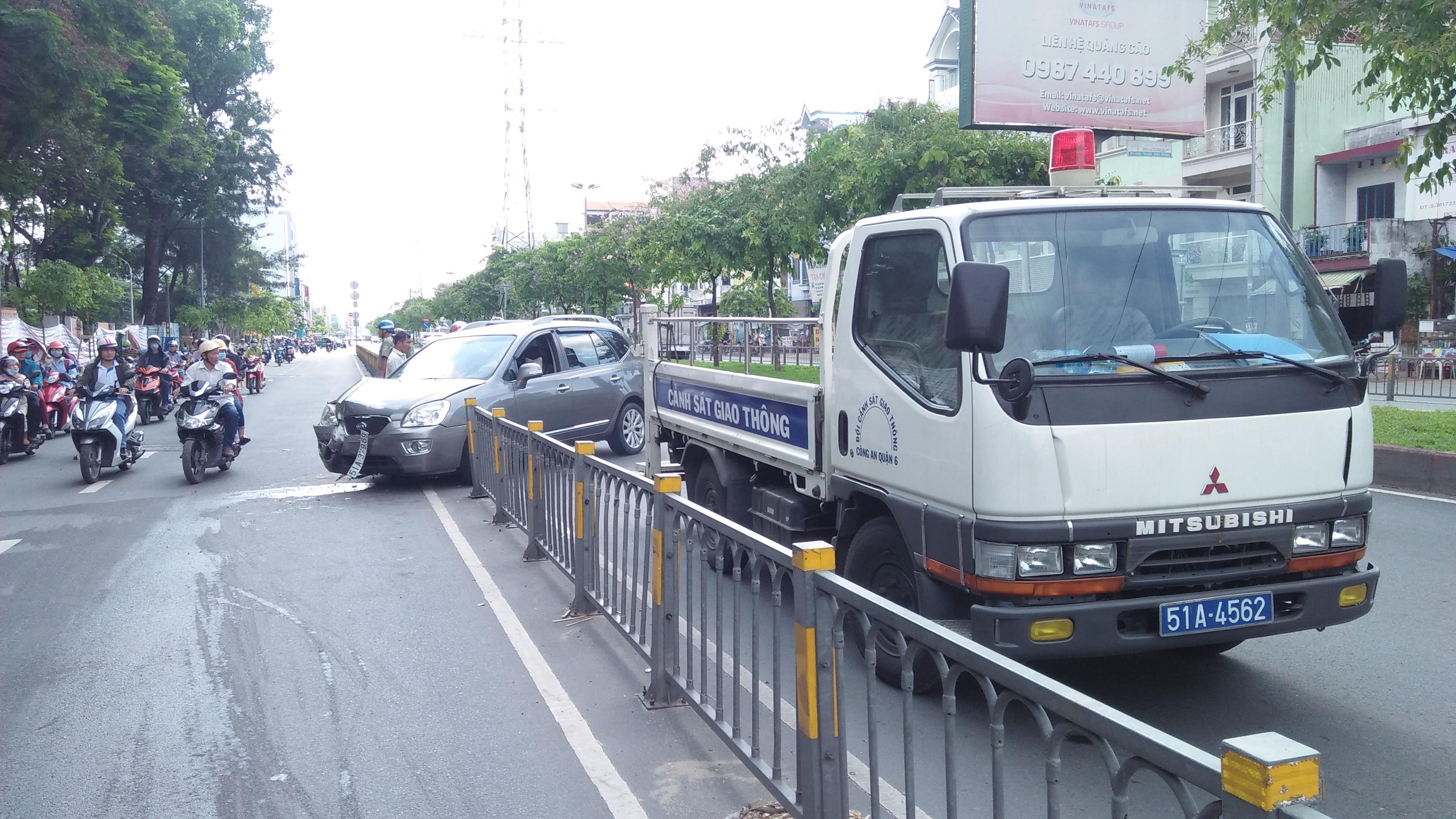 Ngày 26/5, Công an quận 6, TP. HCM đang tiến hành điều tra, làm rõ vụ ô tô mất lái tông dải phân cách bằng sắt trên đường rồi lao sang phần đường xe máy.