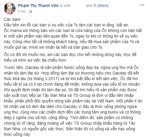 “Đầu tiên xin lỗi các bạn vì vụ việc của TS làm các bạn lo lắng, bất an. Ốc mama xin thông báo với các bạn là cửa hàng của Ốc không còn bán bất kì một sản phẩm nào liên quan đến TS, ngay từ khi có thông tin về vụ việc này. Cũng như tất cả những khách hàng, nếu đã mua sản phẩm của TS và muốn gửi lại, mình xin nhận lại hết và bàn giao cho TS. Ốc có đôi lời muốn nói, xin các bạn đọc cho hết những dòng này. Đọc để hiểu và nhìn sự việc đa chiều hơn.