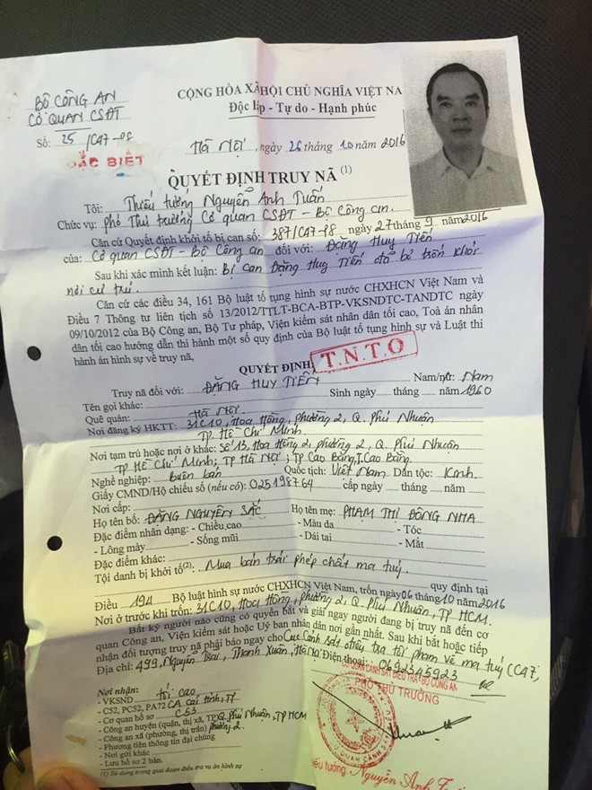 Ngày 26-10-2016, Cục CSĐT tội phạm về ma túy đã ra quyết định truy nã đặc biệt Đặng Huy Tiến về hành vi nêu trên.
